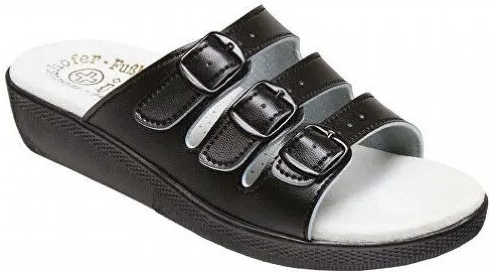 Zdravotní obuv – dámský pantofel, Barva: černá, Podešev: tmavá, Stélka: anatomicky tvarovaná, Materiál: stélka – useň, svrch – syntetický materiál.