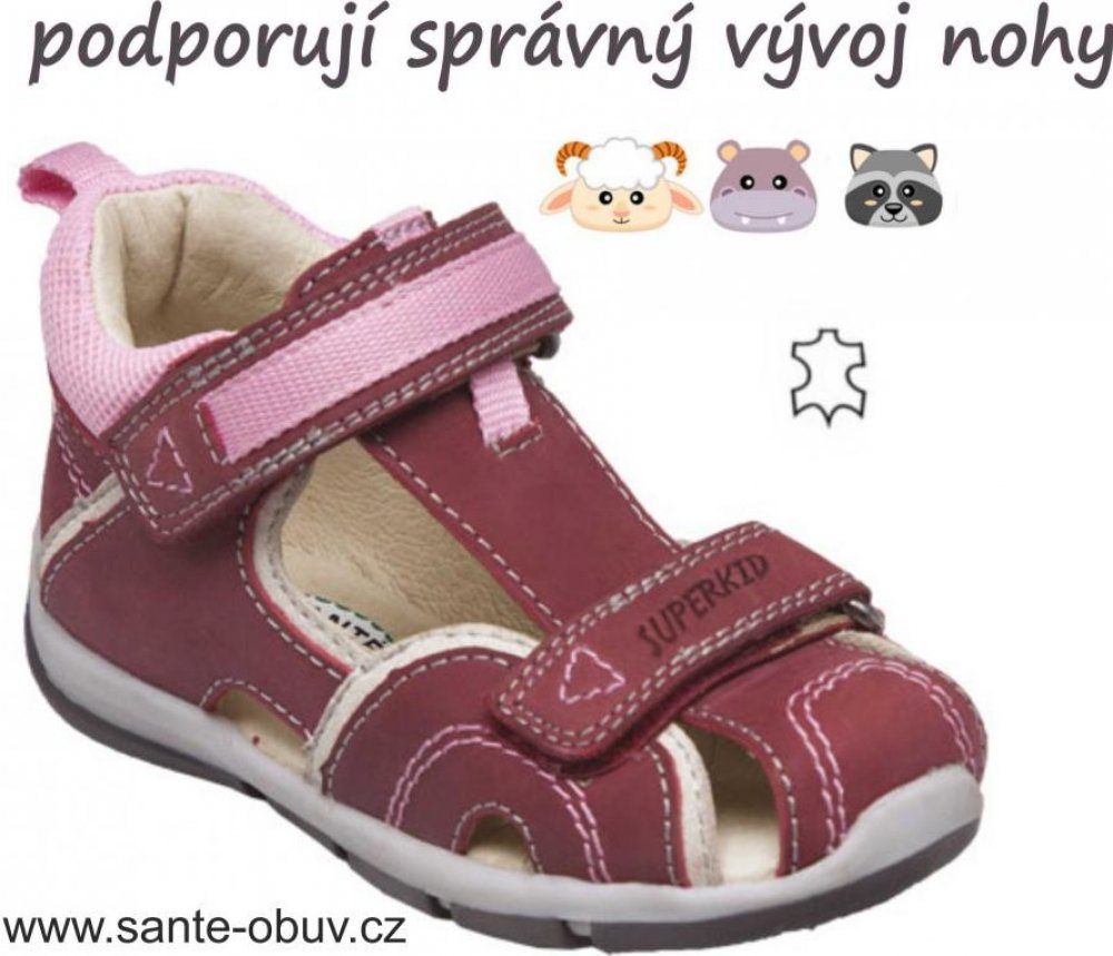 Zdravotní, velmi kvalitní, kožená vycházková obuv Santé - podporující správný vývoj nohy nejmenších. Kožené sandálky Santé se zapínáním na dva suché zipy s částečně krytou špičkou, která chrání nožičky a současně poskytuje dostatek prostoru pro prstíky. Sandály mají pevný opatek, dobře fixují patičky dětí a lehkou ohebnou podešev. Stélka je také kožená, tlumí nárazy a absorbuje pot.Péče a pohodlí ...