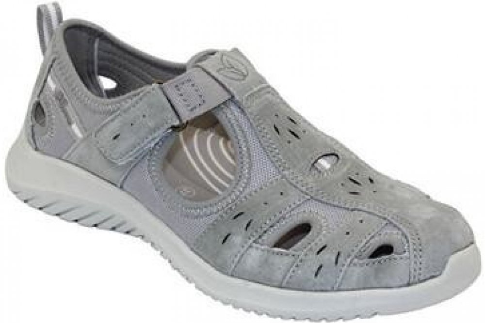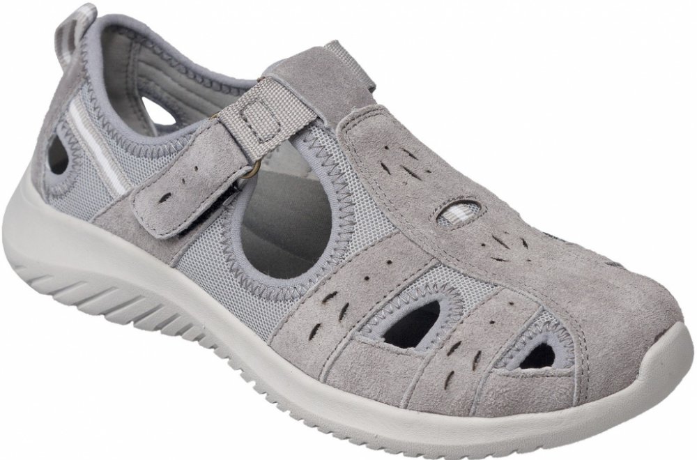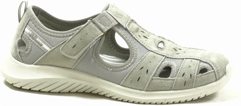Vrchový materiál tvoří useň (kůže) v kombinaci s textilem ve světle šedé barvě. Obuv má nártový pásek na suchý zip pro snadné a přesné nastavení.