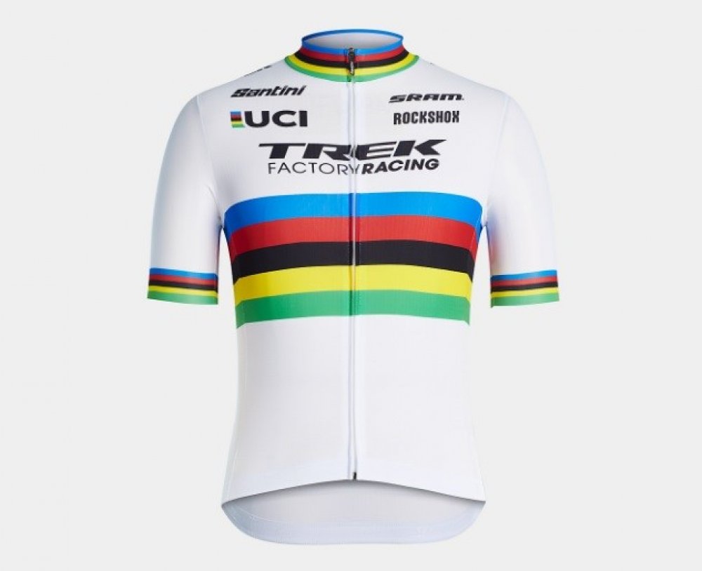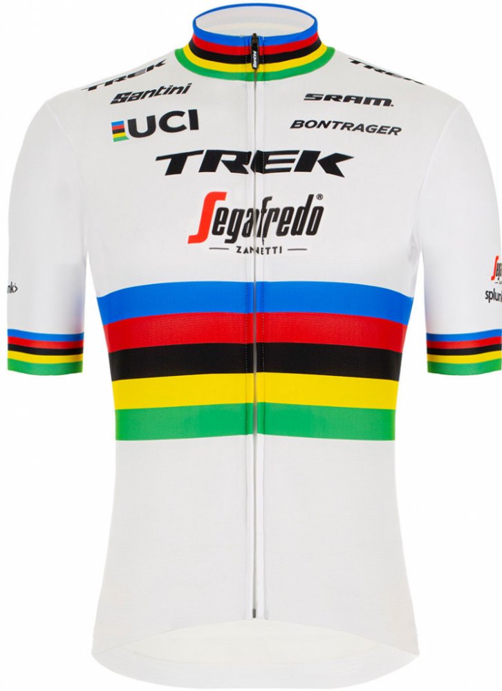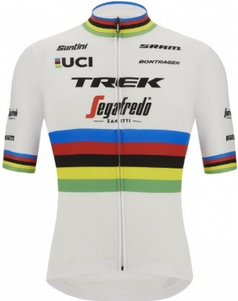 Celorozepínací dres s krátkým rukávem týmu Trek Segafredo pro rok 2022 od italské značky Santini v barvách duhy světového šampiona. Tento dres má právo pro letošek vozit mistr světa do 23 let Filippo Baroncini. A jestli ten pocit chcete zažít také, máme tu pro vás limitovanou edici. Opět je to tedy italská výroba, takže je s tím potřeba počítat při výběru vhodné velikosti. Italské velikosti jsou o velikost menší, tzv. po mladším sourozenci. Vzadu dres disponuje třemi prostornými kapsami. Dole je dres zakončen širokou gumovou manžetou se silikonovým potiskem proti nežádoucímu vyhrnování. Jedná se o řadu Fan Line. Materiál: mat. č.1 (77%, tělo): 100% Polyester; mat. č.2 (7%, lemy): 100% Polyester; mat. č.3 (16%, rukávy): 70% Polyester, 30% Elastan.