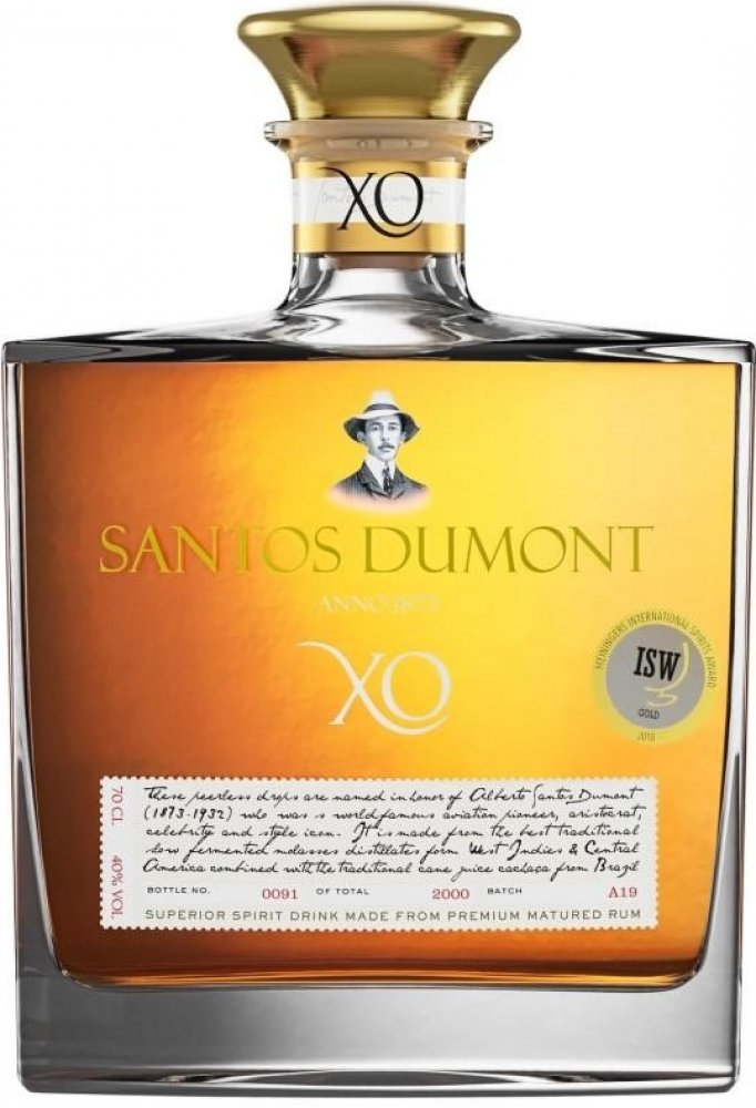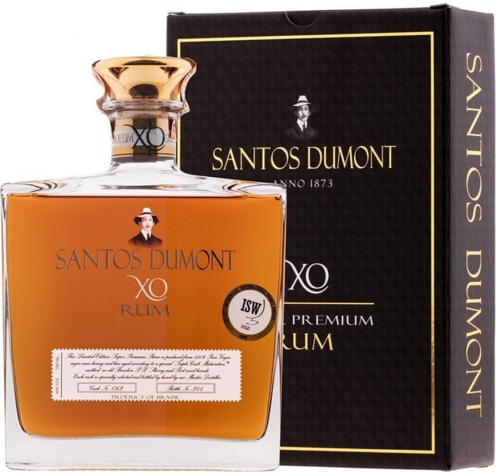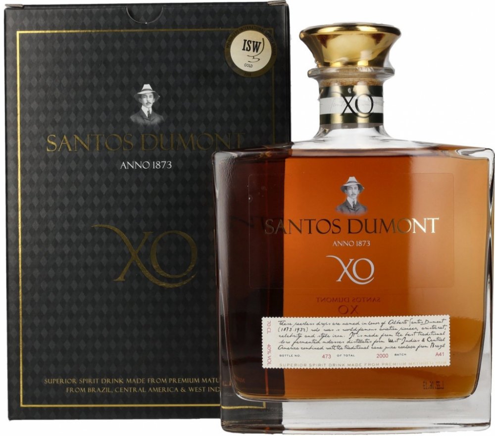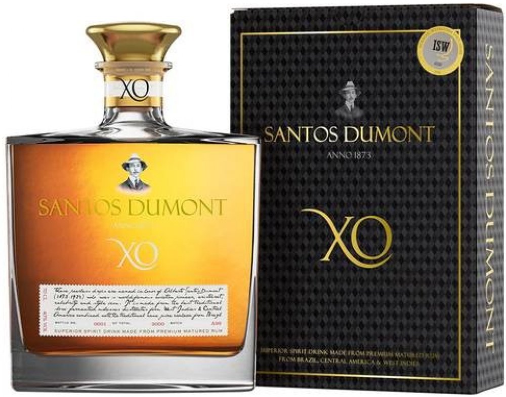 Rum SANTOS DUMONT XO je původem z Brazílie. Prochází velmi dlouhou dobou skladování. Prémiový rum je přibližně 20 let starý, díky čemuž je chuťově tak delikátní. Vyrábí se v malých sériích a v omezeném počtu, takže každá láhev je očíslována. Tento rum je doslova legendou a neměl by chybět ve vašem domácím baru. Nejlépe chutná čistý, ale lze přidat i do legendárních míchaných nápojů.