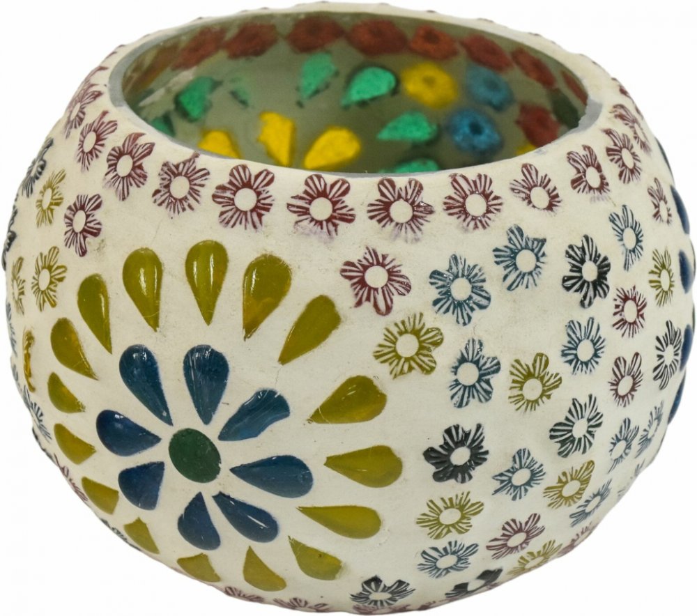 Skleněná lampička s barevnou mozaikou vnese do interiéru radost, světlo a jemný orientální akcent. Kulatý tvar je ručně zdoben drobnými skleněnými kamínky uspořádanými do květinových motivů, které po rozsvícení svíčky vytvářejí hru barev a měkkých odlesků. Každý kus je originál, v němž se snoubí řemeslná práce s lehkostí a hravostí indického designu. Díky svým kompaktním rozměrům je ideální na par...