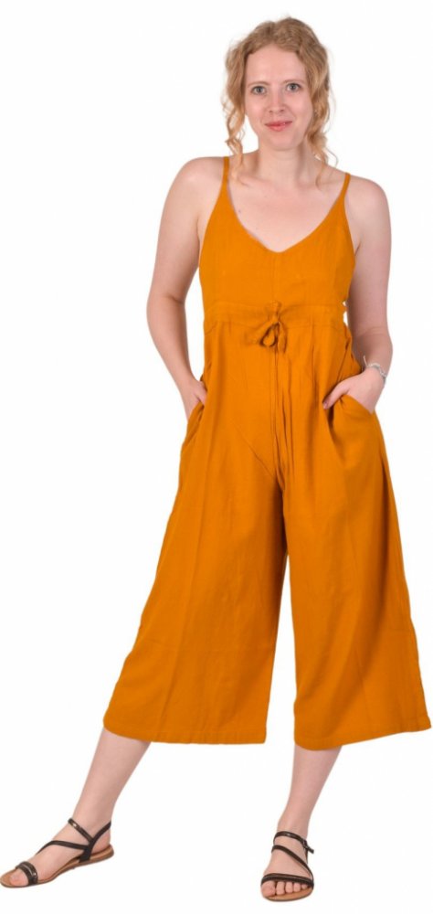 Chcete v létě zazářit? Vyberte si tento tříčtvrteční overal v okrově žluté barvě! Díky volnému střihu vám v něm bude dobře i v těch nejteplejších dnech. Je na ramínka a doplňují jej praktické kapsy na drobnosti. Užijte si pohodové léto s našimi stylovými kousky z Nepálu. Overal byl vyroben ze 100% bavlny.