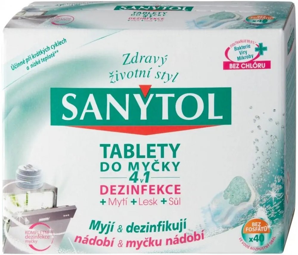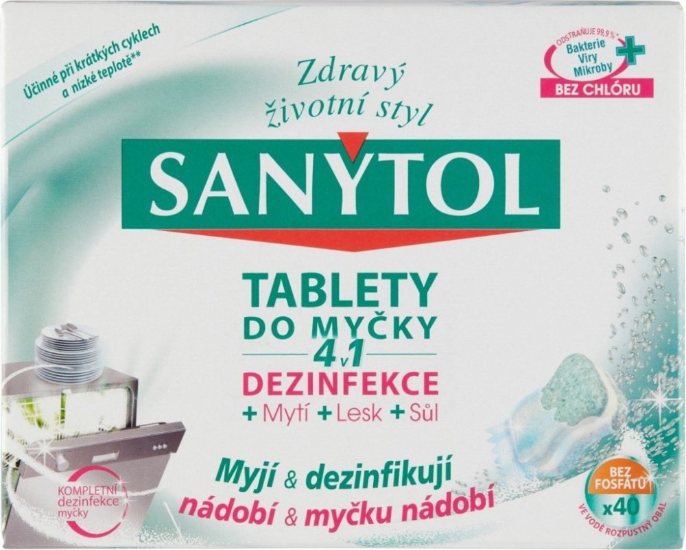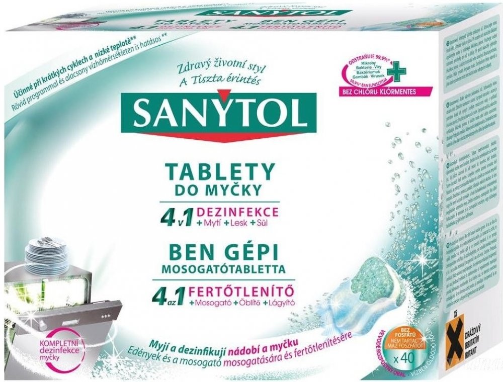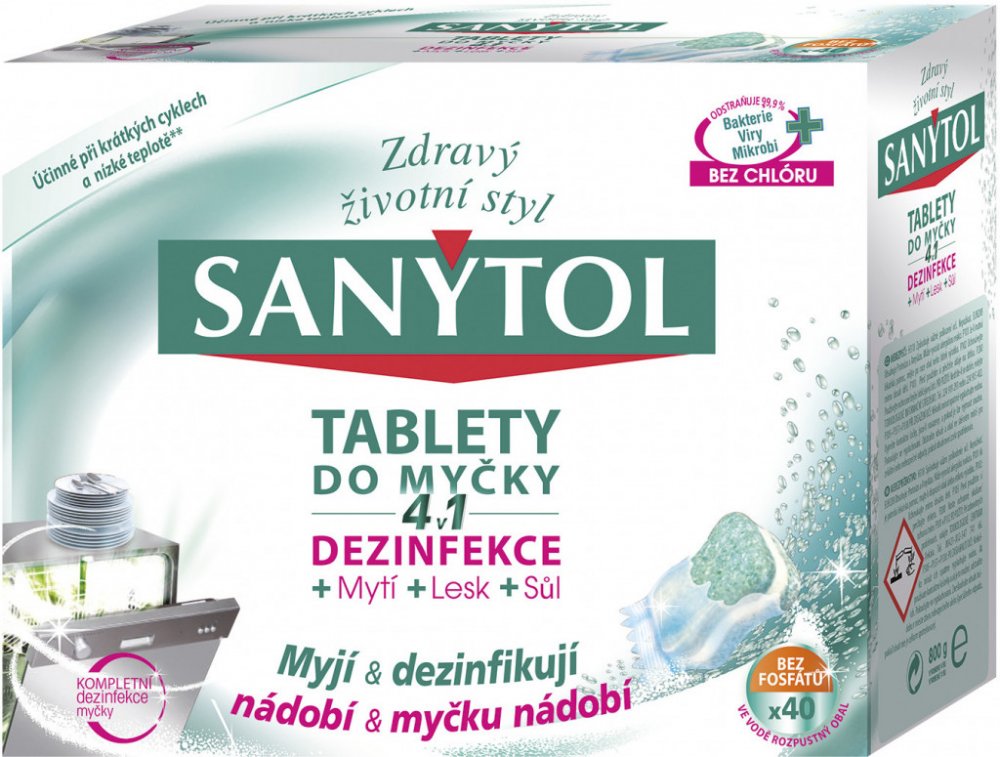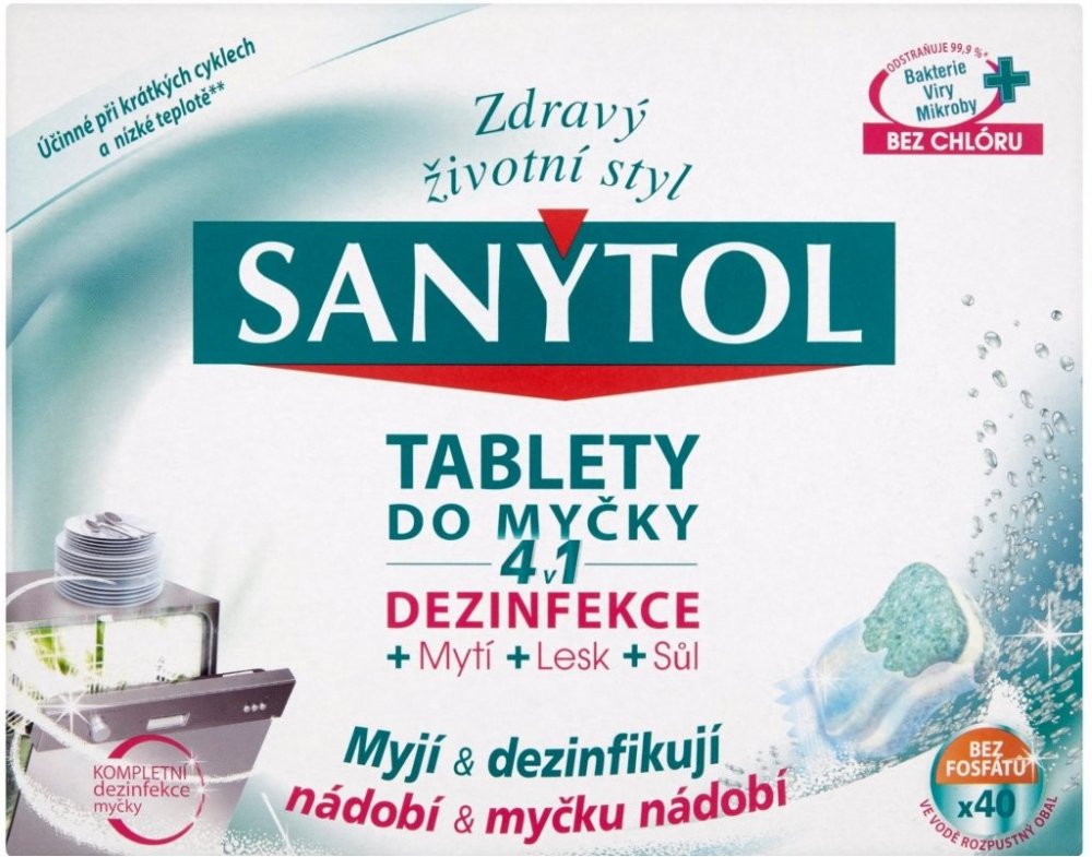 Velká část otrav jídlem pochází z domácí kuchyně. Proto je nezbytná dezinfekce, aby se zabránilo šíření nežádoucích mikroorganismuů. Sanytol, expert na dezinfekci bez chlóru vyvinul tablety do myčky na nádobí 4 v 1, které kombinují zároveň dezinfekci, mytí, sůl a oplach. Jejich jedinečné složení tak zajišťuje optimální čistotu nádobí (bez předoplachu) a vlastní myčky i při krátkých programech a mytí na nízké teplotě**.
