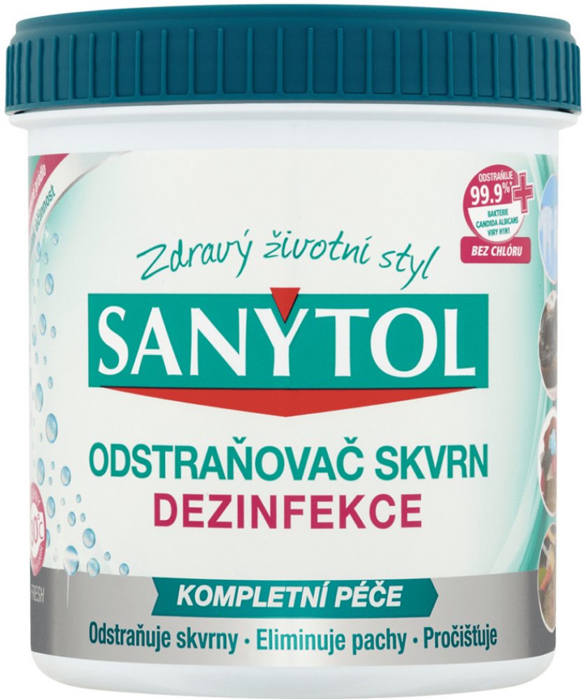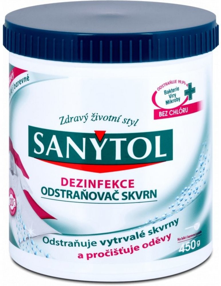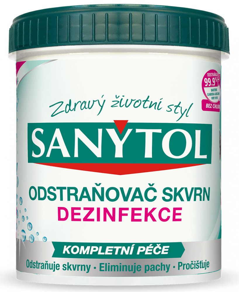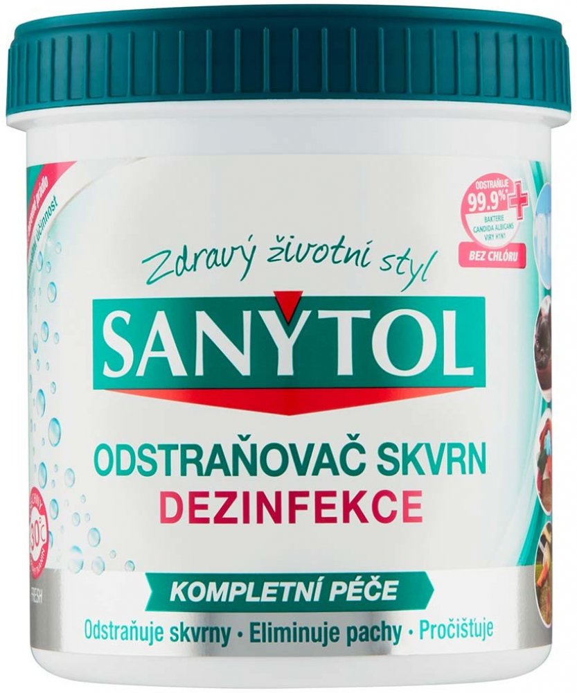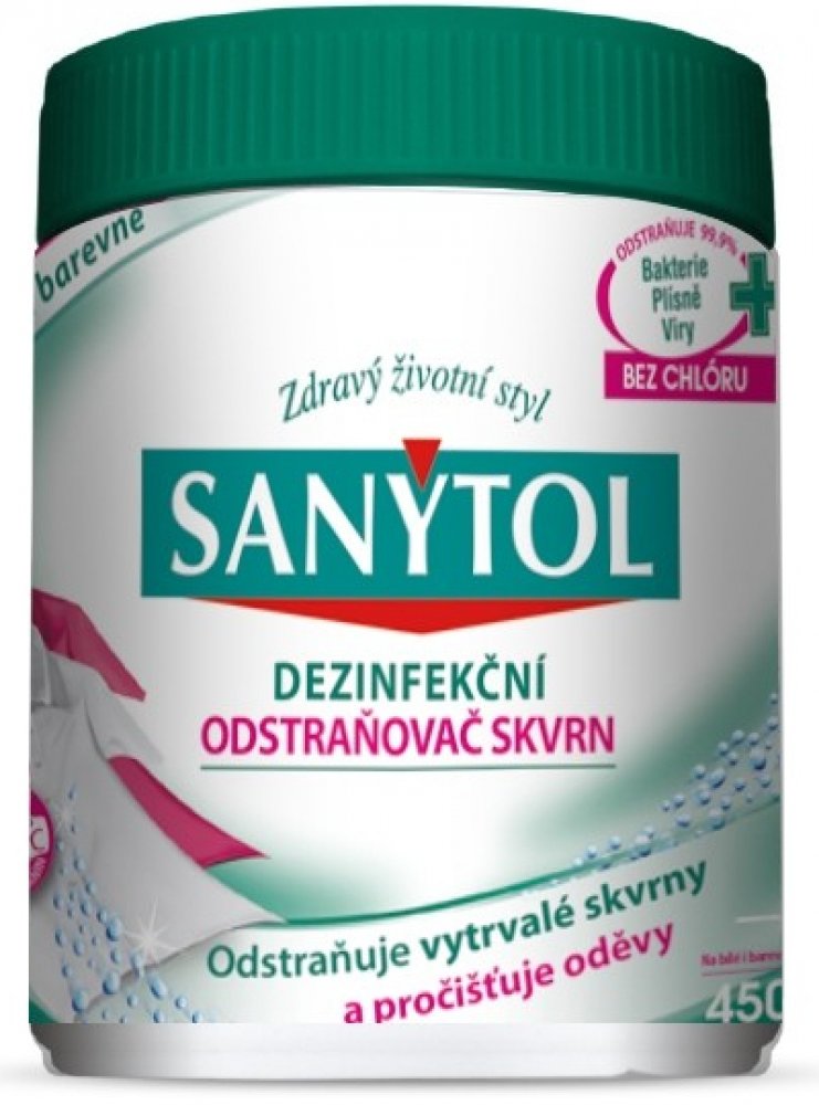 Víte, že... Sanytol dezinfekční odstraňovač skvrn ničí 99,9% bakterií, virů a kvasinek a účinně odstraňuje vytrvalé skvrny již od prací teploty 30°C. Díky složení bohatému na enzymy prostupuje do vnitřku textilních vláken a uvolňuje činidla odstraňující skvrny, čímž dosahuje dokonalých výsledků jak u bílého, tak i u barevného prádla.