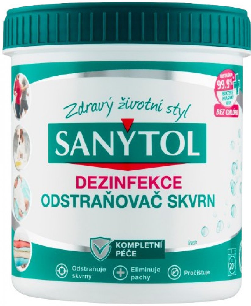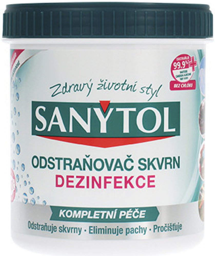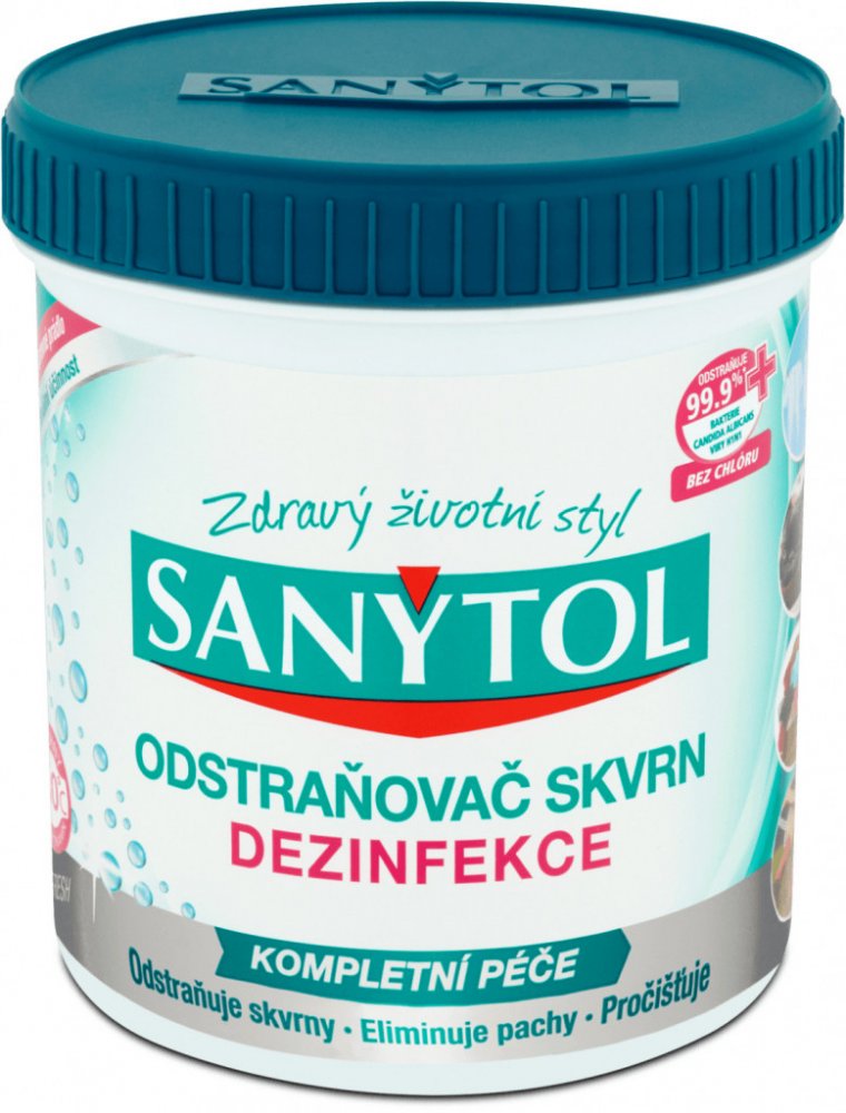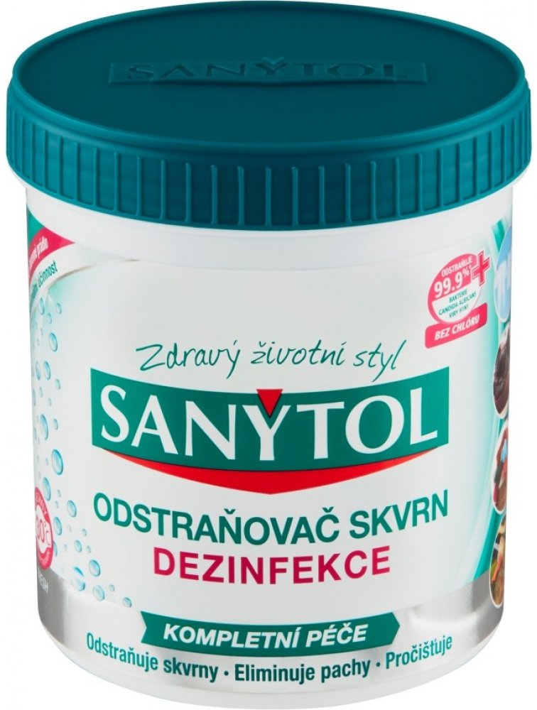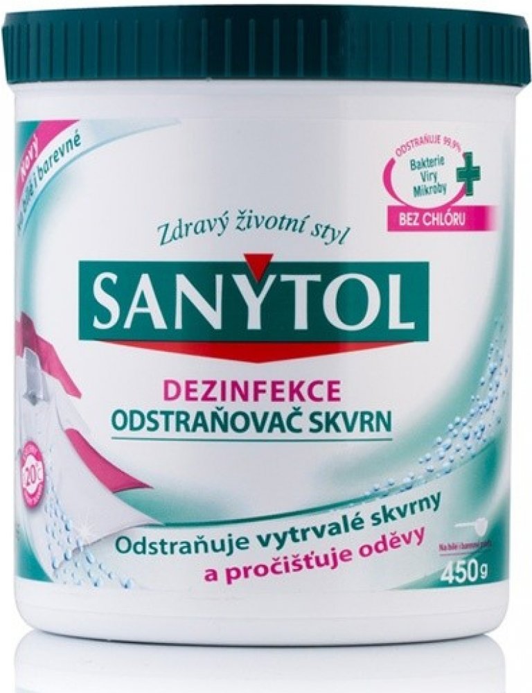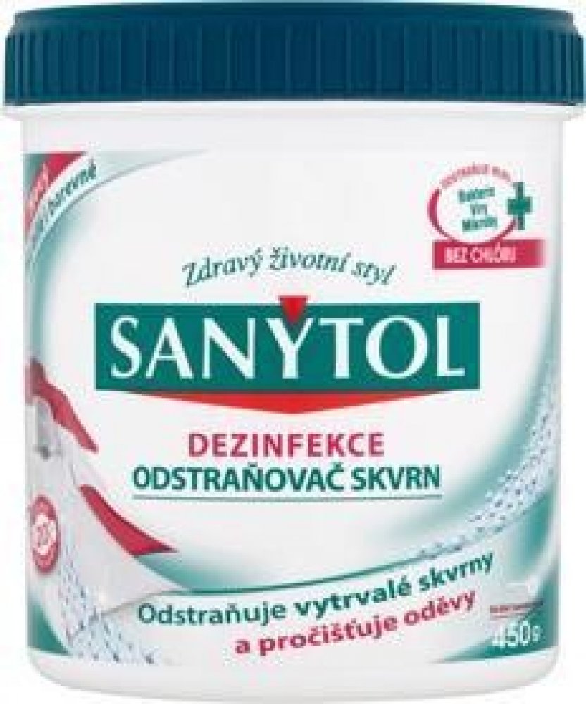 Víte, že... Sanytol dezinfekční odstraňovač skvrn ničí 99,9% bakterií, virů a kvasinek a účinně odstraňuje vytrvalé skvrny již od prací teploty 30°C. Díky složení bohatému na enzymy prostupuje do vnitřku textilních vláken a uvolňuje činidla odstraňující skvrny, čímž dosahuje dokonalých výsledků jak u bílého, tak i u barevného prádla.