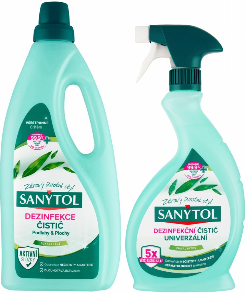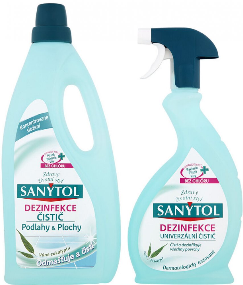 Sanytol dezinfekce čistič podlahy & plochy 1 l + univerzální čistič 500 ml - Čisticí sada obsahuje čisticí prostředek na podlahu, který dezinfikuje všechny povrchy a Sprej univerzal na všechny povrchy s vůní eukalyptu. - Sada Sanytol Duopack obsahuje čistič na podlahy a plochy a univerzální čistič ve spreji. Oba přípravky vám zajistí hygienicky čistou domácnost. Dezinfekce Sanytol nabízí hned troj...