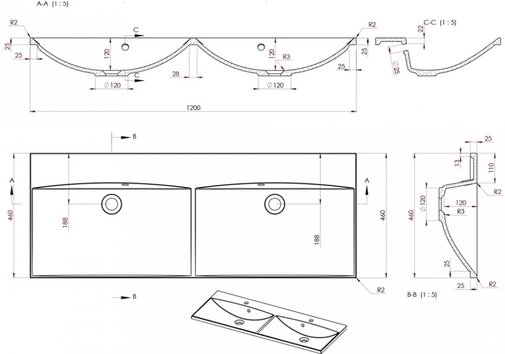 Sapho mramor dvojumyvadlo 1200 mm 460 mm 22.85 kg do nábytku 120 mm bílé obdélníková