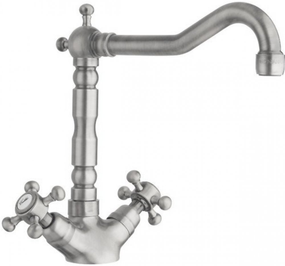 Dřezová stojánková baterie s retro hubicí Ramínko baterie je otočné Připojení k přívodu vody 3/8" Rozměry: 195/175/240 mm Materiál: mosaz Povrchová úprava: nikl Baterie je standardně dodávána s označením teplé a studené vody v českém jazyce. Součástí baterie je i balíček s označením vody v anglickém jazyce Hot a Cold. Na dotaz lze dodat i označení v italském nebo francouzském jazyce. V retro stylu...
