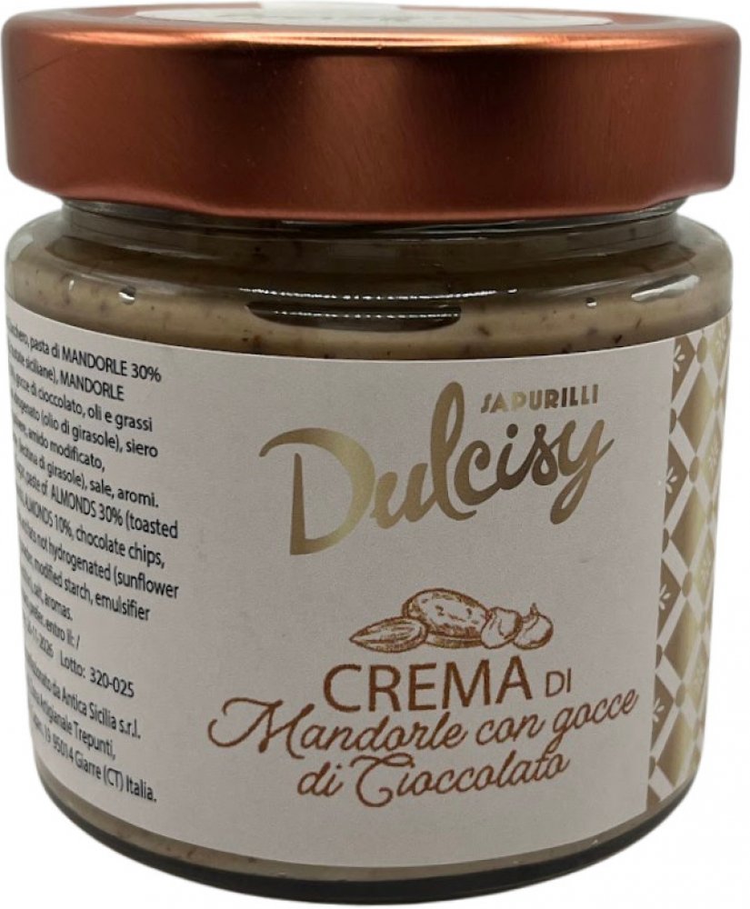 Crema di Mandorle con Gocce di Cioccolato od Sapurilli Dulcisy je výjimečný mandlový krém obohacený o křehké kousky kvalitní čokolády, které při každém soustu roztančí vaše chuťové pohárky. Základem jsou jemně mleté mandle, které dodávají krému jeho krémovou strukturu a přírodní sladkost, zatímco čokoládové kapky přinášejí příjemné překvapení a hloubku chuti.