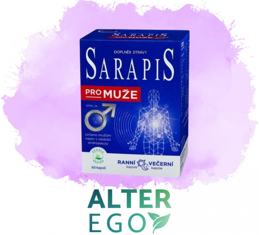 SARAPIS pro muže řeší obtíže spojené s nedostatkem testosteronu. Určeno mužům po 40. roce věku. Pro období tzv. mužského přechodu. Balení obsahuje dva druhy kapslí – ranní a večerní o různém složení. Přispívá k hormonální rovnováze a pozitivní náladě, relaxaci, dobrému spánku a antioxidaci. Pomáhá udržovat normální hladinu testosteronu. Obsahuje včelí mateří kašičku, která je považována za elixír ...