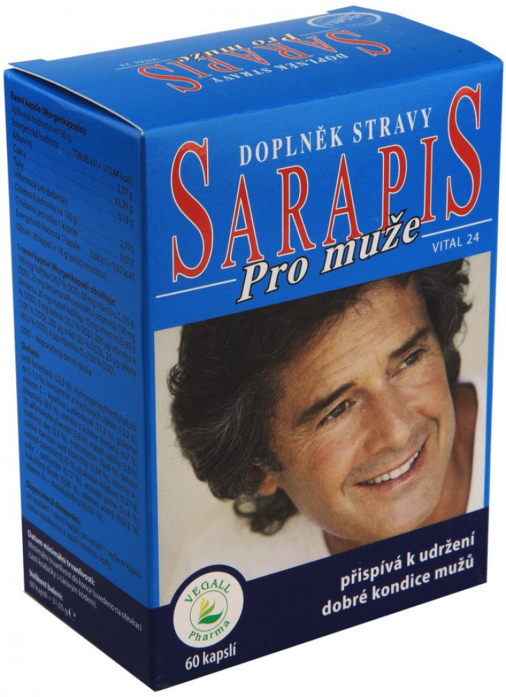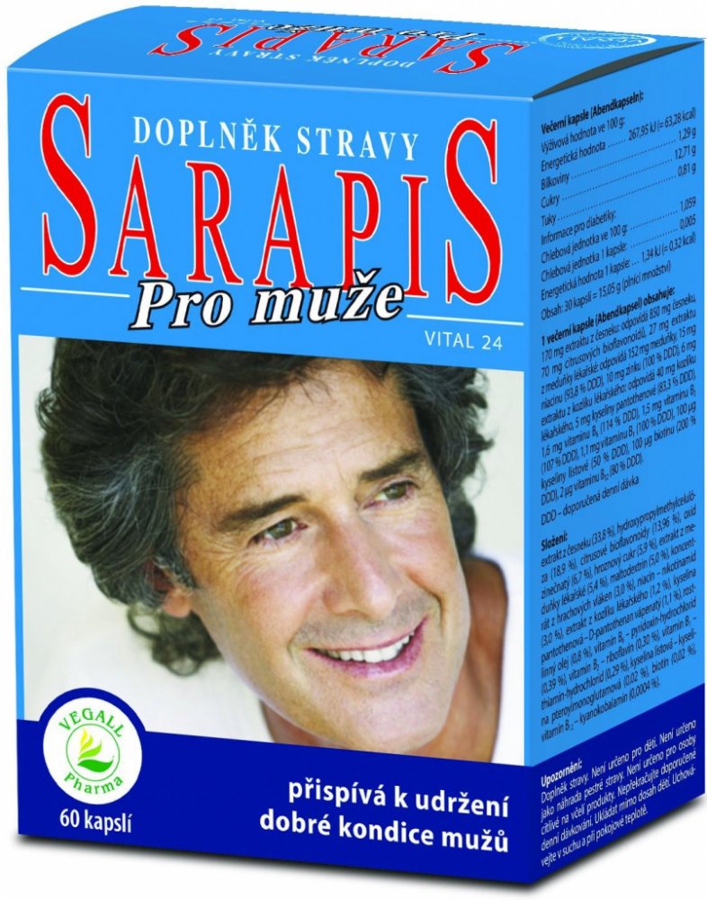 Sarapis 60 tbl kapsle únava a vyčerpání pro muže 31.05 g Sarapis pro dospělé perorální od narození bez příchutě Rakousko multivitamínové komplexy energie a koncentrace 30 1 ks ráno a 1 ks večer Suché místo + pokojová teplota, Mimo dosah dětí