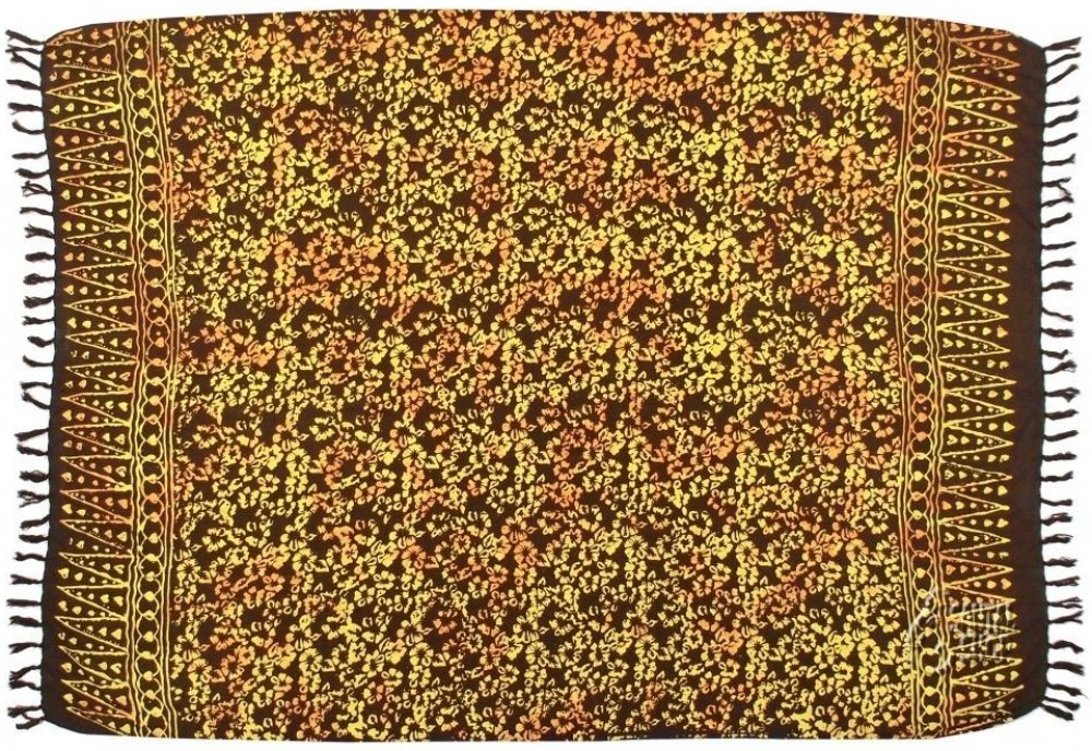 Ručně batikovaný plážový šátek sarong je zdobený barevným motivem květů orchidejí na hnědém podkladu.