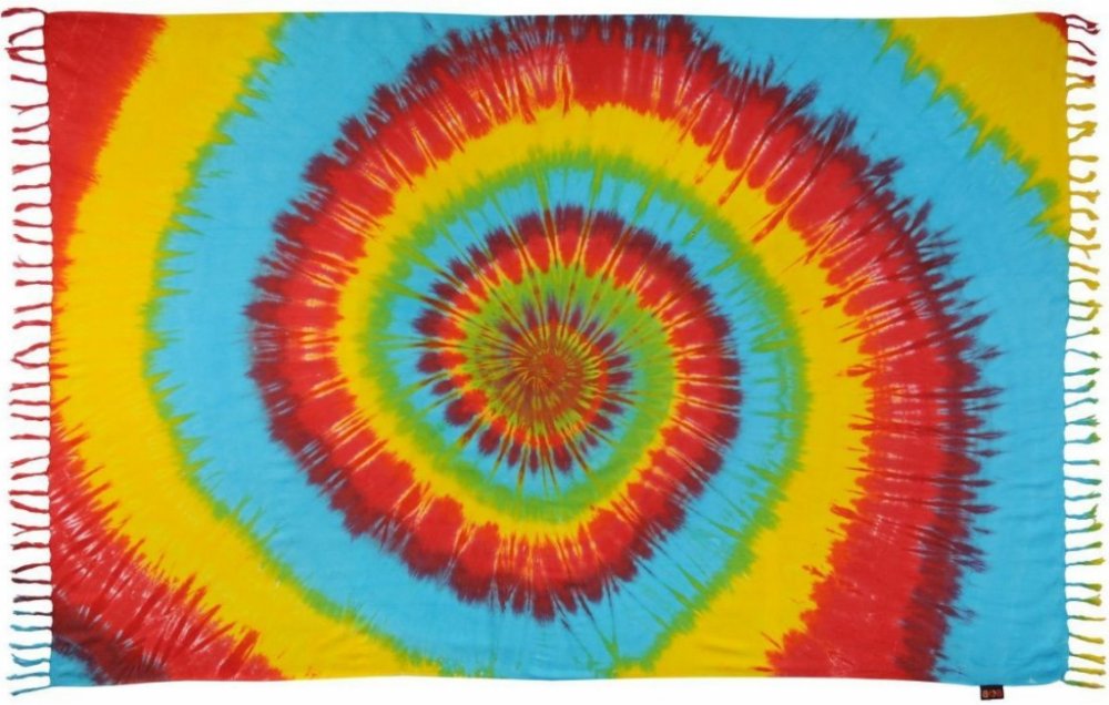 Velký plážový šátek sarong je zdobený ručně batikovaným vzorem duhové spirály.