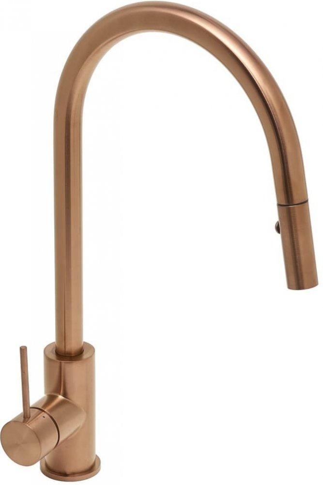 Páková stojánková dřezová baterie s vytahovací sprškou, 2 proudy. V kulatém designu v barevném provedení broušená rose gold. Výška baterie je 44 cm. Ramínko je ve výšce 23,5 cm. S matným povrchem ZÁRUKA 5 LET, dostupnost náhradních dílů 10 LET.