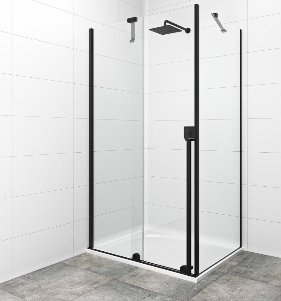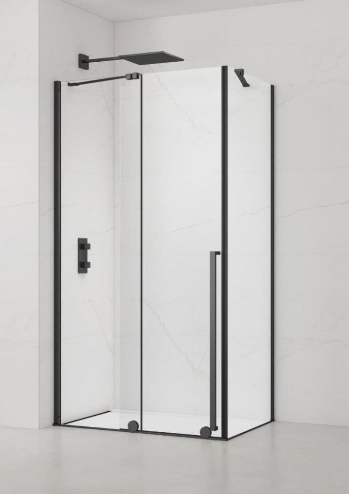 Sprchová zástěna walk-in včetně boční zástěny s profilem v černém matném provedení. a výplní z čirého skla s dekorem transparent. S povrchovou úpravou Easy Clean, která usnadňuje čistění a minimalizuje usazování vodního kamene. Posuvný systém otevírání. Levá i pravá orientace.