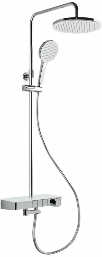 Elegantní sprchový systém s nástěnnou termostatickou baterií s pojistkou proti opaření. Sprchový systém disponuje 3 tlačítky, které umožňuje přepínání proudů hlavové sprchy, ruční sprchy a výtokového ramínka na napouštění vany, nebo kbelíku. Ovládání baterie nereguluje průtok. Rozteč baterie je 150 mm. Sočástí systému je polička z temperovaného skla a sprchová hadice v délce 150 cm.