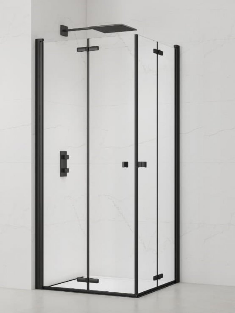Sprchový kout bez vaničky a barvou profilů v černé barvě, výplň je z čirého skla bez dekoru. Produkt je opatřen povrchovou úpravou Easy Clean, která usnadňuje čistění a minimalizuje usazování vodního kamene. Zalamovací systém otevírání. Určení - levá i pravá orientace.