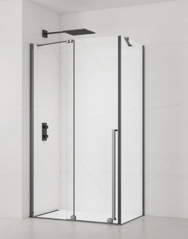 Sprchový kout včetně boční zástěny v PVD Gun metal barvě, výplň je z čirého skla bez dekoru. Produkt je opatřen povrchovou úpravou Easy Clean, která usnadňuje čistění a minimalizuje usazování vodního kamene. Posuvný systém otevírání. Určení - levá i pravá orientace.