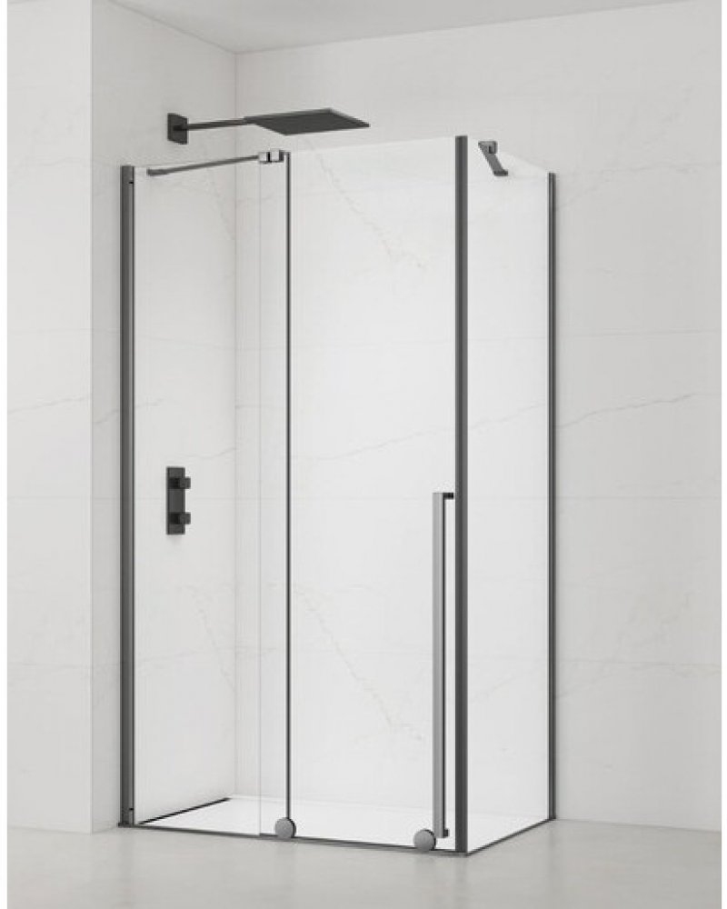 Sprchový kout včetně boční zástěny v PVD Gun metal barvě, výplň je z čirého skla bez dekoru. Produkt je opatřen povrchovou úpravou Easy Clean, která usnadňuje čistění a minimalizuje usazování vodního kamene. Posuvný systém otevírání. Určení - levá i pravá orientace. ZÁRUKA 5 LET, dostupnost náhradních dílů 10 LET.