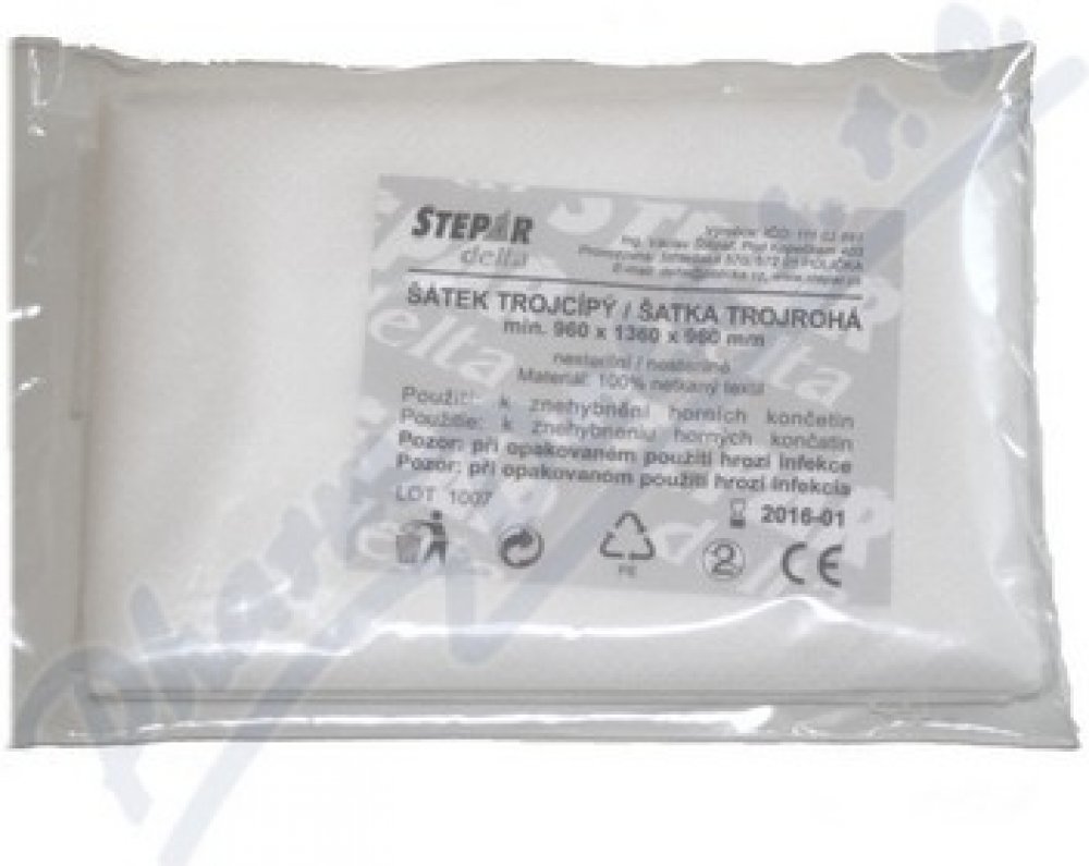 Šátek trojcípý z netkaného textilu o rozměrech 960 x 1360 x 960 mm, zabalen v PE obalu uzavřeném na zip. Měl by být součástí vybavení každé lékárničky, vhodný pro první pomoc pro znehybnění horní končetiny.Šátek trojcípý se používá k fixaci horní končetiny při zlomenině - první pomoc, vybavení všech typů lékárniček.Rozměr 960 x 1360 x 960 mm.Balení obsahuje 1 ks.