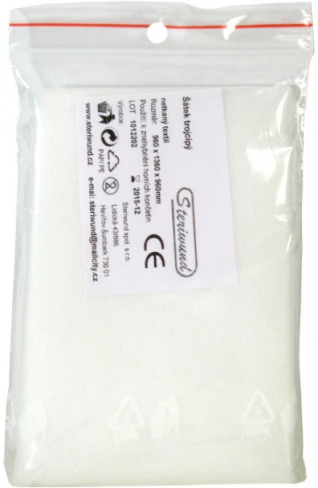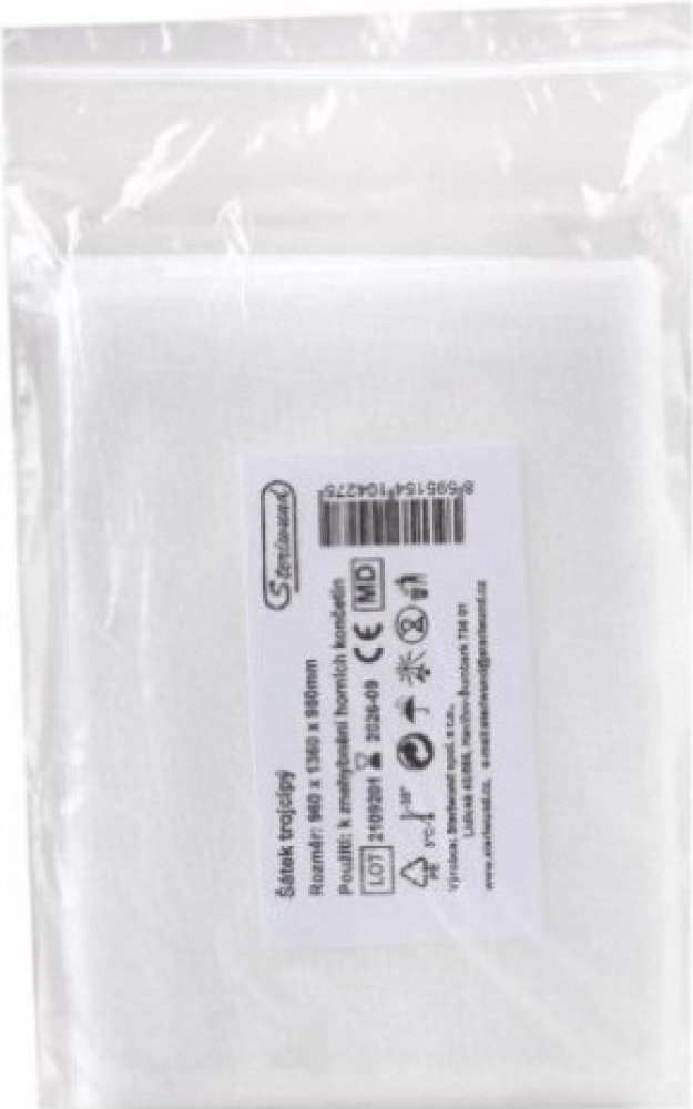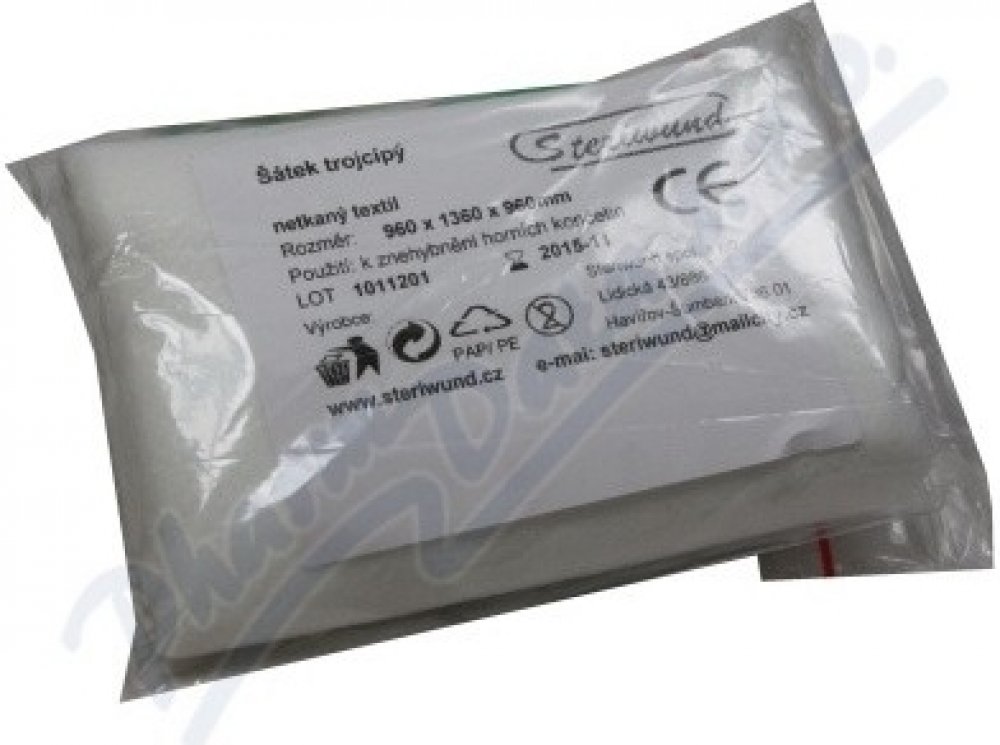 Trojcípý šátek z netkané textilie bílé barvy o velikosti 96 x 96 x 136 cm. Využijete ho v předlékařské pomoci i ambulantní péči, při poranění a fixaci zejména končetin, hlavy apod. Jednotlivě balený.