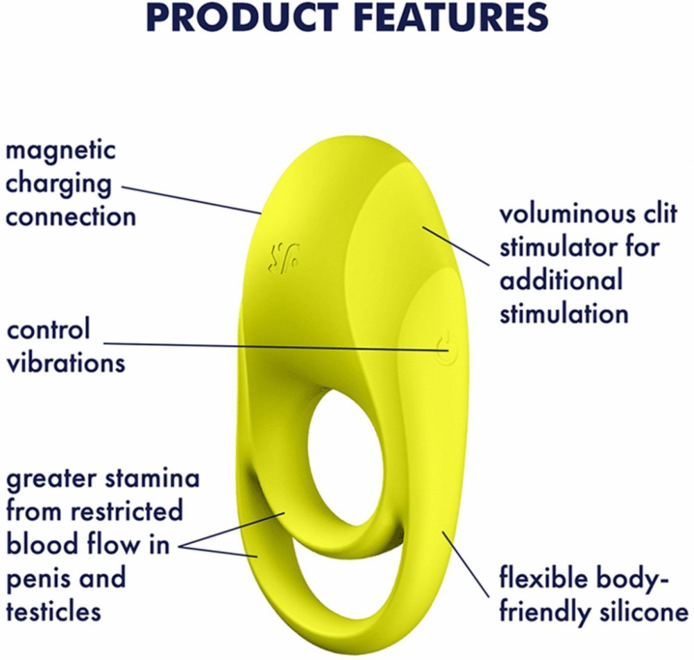 Tento designový kousek v hravé žluté barvě je vyroben z jemného lékařského silikonu prvotřídní kvality, který je zdravotně nezávadný pro lidskou pokožku a něžně pohladí vaše intimní partie. Je měkký a příjemný na dotek a má ergonomický tvar se stimulačními hranami, který je na jedné straně zesílený a zaoblený, aby perfektně seděl a vyhledal klitoris. Dva kroužky v elegantním provedení jsou určeny na penis a na varlata, čímž docílíte výrazně lepší fixace a stability, takže vám jen tak nesklouzne a zůstane hezky na svém místě. Vlastností kroužku je udržet nahromaděnou krev v penisu, čímž dojde ke zkvalitnění a prodloužení erekce a oddálení ejakulace. Vaše polovička se tedy dočká nárůstu vašeho výkonu, přičemž sama bude uspokojována nejen vámi, ale také jeho moderními vibracemi. A to milují všechny ženy. Kroužky jsou roztažitelné a flexibilní, aby skvěle padly a dobře se přizpůsobily téměř všem průměrům.