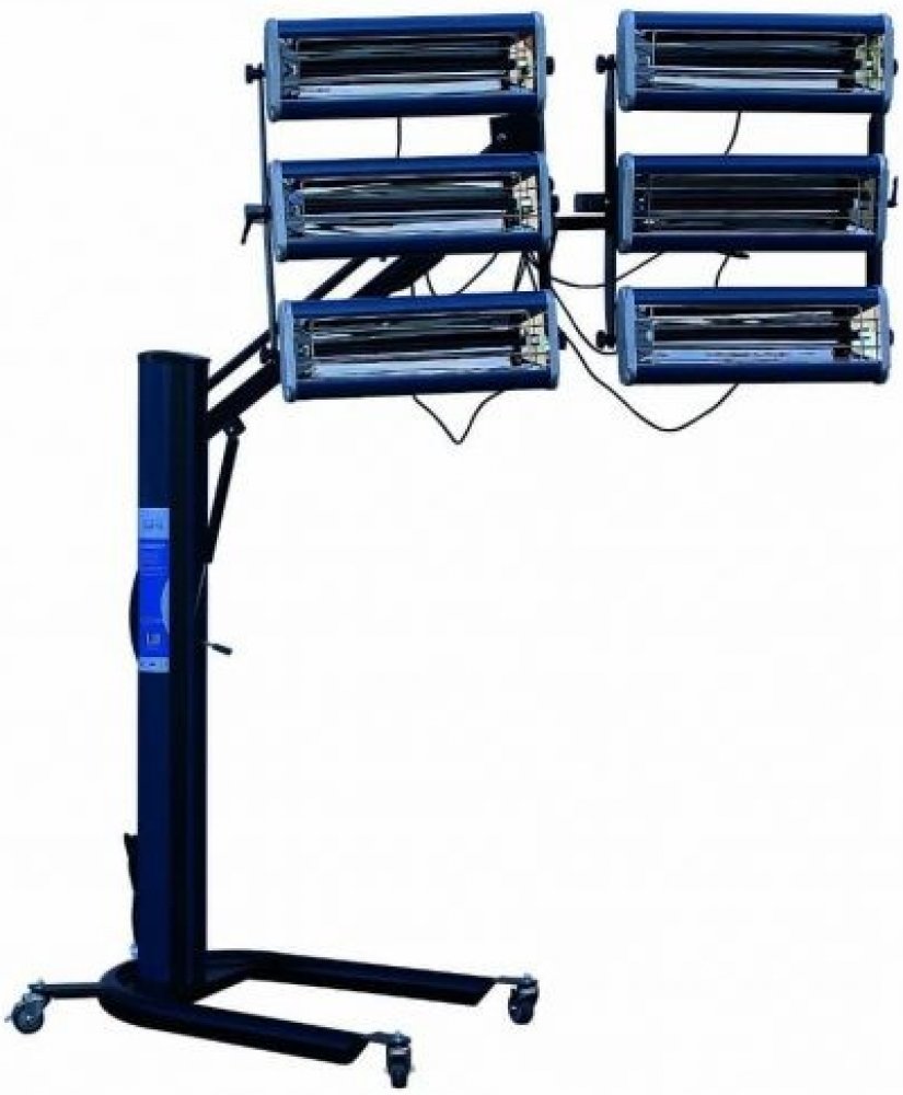 Přístroj se 6 lampami se používá při urychlování práce v autolakovnách. „Infralampa“ vysílá krátkovlnné infračervené záření (vlny) vytvářející teplo. Kov, na kterém je čerstvý lak nanesen, se rovnoměrně zahřeje a barva se tím suší a vytvrzuje. Okolní vzduch se však neohřívá.Výkonná a rozměrná varianta se šesti samostatnými lampami, určená pro vysoušení rozsáhlých povrchů. Každou z lamp lze zapnout zvlášť a tím zářič přizpůsobit momentálním podmínkám. Výšku a sklon zářičů lze pohodlně nastavit podle aktuální potřeby, aby fungoval co nejúčinněji.Manipulaci usnadňují čtyři kolečka.Technická data:Napájení: 230 V; 50/60 HzJmenovitý výkon: 6000 WNastavení výšky: 0.2 – 2.1 mPracovní proud: 27.2 AVýstupní teplota: 40 – 80 °CNastavení času: 0.1 – 30 minPracovní vzdálenost: 0.5 – 0.7 m