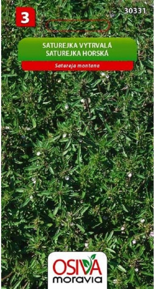 Trvalka, vysoká 40 cm. Sbírá se nať, která je ve stejné kvalitě od jara až do silnějšího mrazu. Lze ji nahradit saturejkou zahradní - jednoletou. Používá se jako koření nebo v léčitelství proti nadýmání a průjmu. Jak pěstovat saturejku: Saturejka zahradní potřebuje dostatek světla a tepla, především miluje slunce a rozhodně jí nevadí ani dlouhodobé sucho. Špatně snáší zamokření. Saturejce se dobře daří jak na zahradě, tak v květináči na balkoně nebo na okenním parapetu. Na záhonu vyžaduje kyprou hlinitopísčitou dobře propustnou na živiny nepříliš bohatou půdu. Do květináčů a truhlíků se vyplatí k zemině přidat hrubý písek. Pokud se na zahradě potýkáme s mšicemi, mravenci a běláskem zelným, na záhony se zeleninou a květinami vysadíme či vysejeme saturejku, která tyhle škůdce spolehlivě a navíc přírodně odpuzuje. Saturejka je vhodnou sousedkou pro cibuli, fazole, hrášek, salát, špenát, zelí a kapustu. Květy saturejky přilákají do zahrady včely a motýly. Sazenice saturejky zahradní můžeme předpěstovat se semínek. Vzrostlé rostlinky pak vysadíme na záhon do sponu 40 x 40 cm nebo po jedné do květináče po 15. květnu, kdy už nehrozí mrazy. Koncem dubna a v květnu se mohou semínka vysít přímo na záhon. Přímé jarní výsevy je potřeba chránit bílou netkanou textilií. Saturejku, kterou pěstujeme v nádobách zaléváme pečlivě a opatrně, zeminu mezi jednotlivými zálivkami necháme vyschnout a hlavně se vyhneme přemokření, jinak zahyne. Čerstvé listy a větvičky můžeme uřezávat kdykoliv, ovšem během květu je aroma nejsilnější a obsahuje také největší množství účinných léčivých látek.