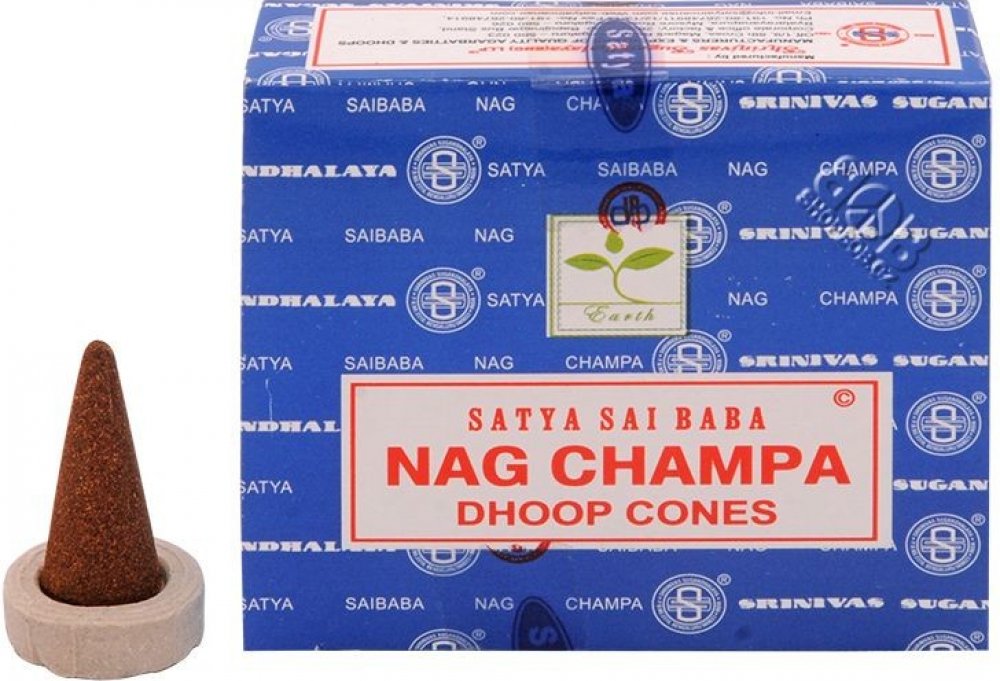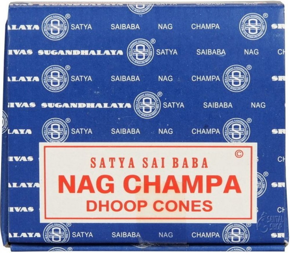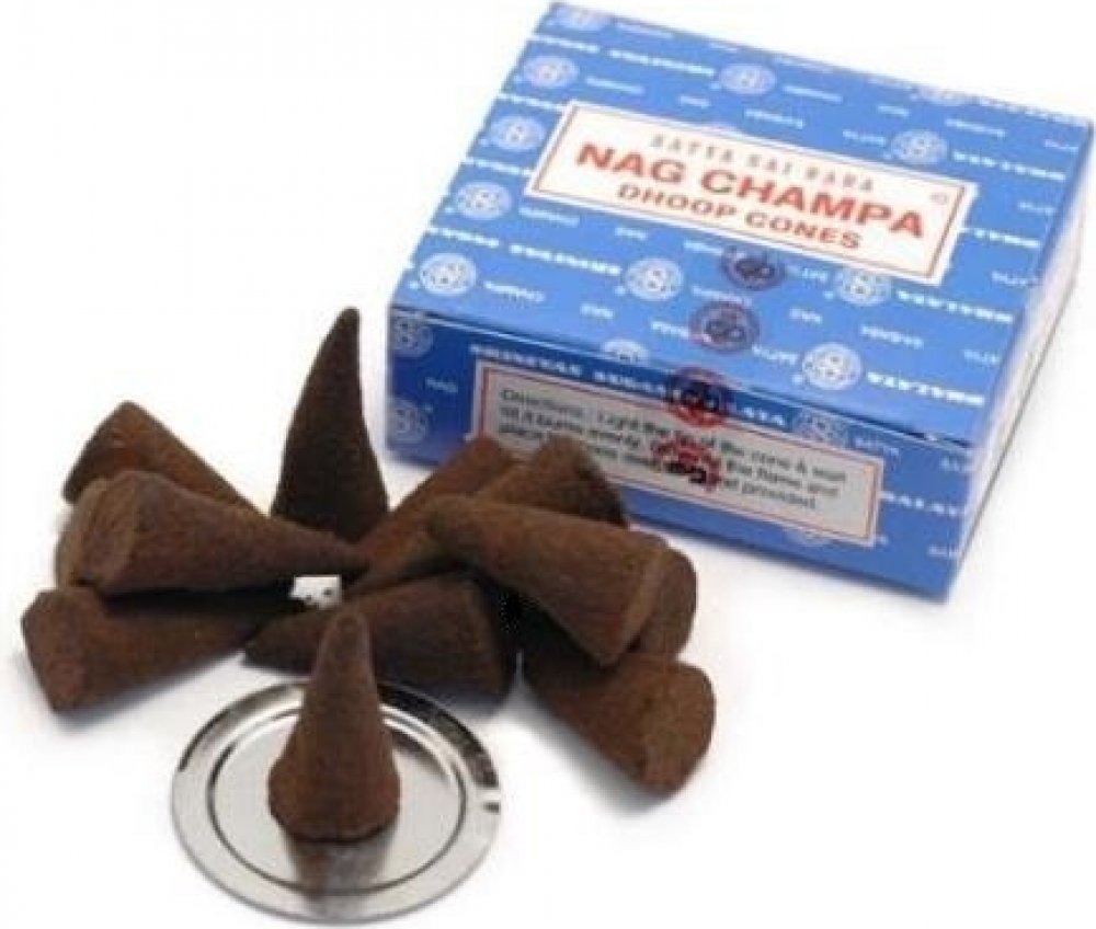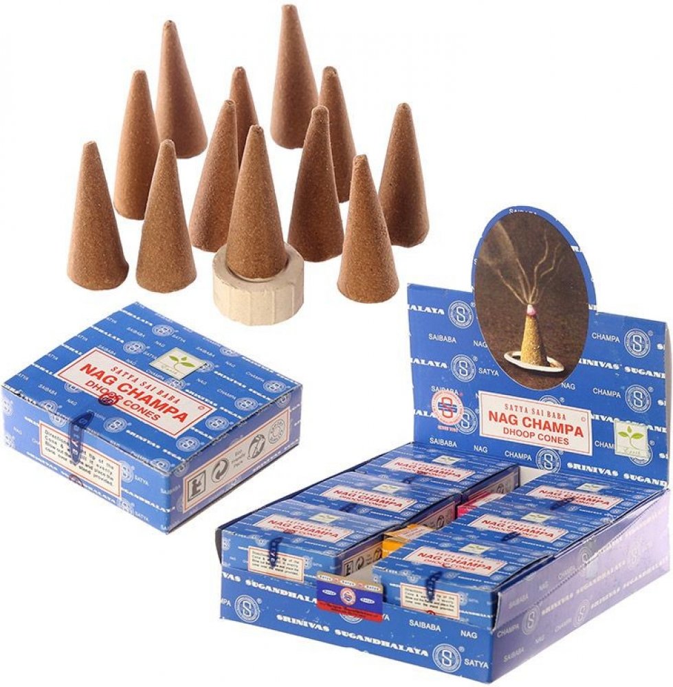 Indické vonné kužele (františky) Satya Sai Baba Nag Champa jsou svému patronovi Sai Babovi, které jsou vyrobeny tradičním uznávaným indickám výrobcem vonných tyčinek a kuželů Shrinivas Satya z pryskyřice a listů a květů stromu Champa, které rostou i v hinduistických klášterech, mají příjemnou vůni a jsou výborné pro meditace a navození příjemné atmosféry. Vonné kužele(františky) Satya Sai Baba Nag Champa kužele mají nejpopulárnější indickou omamnou orientální vůní Nag Champa (květů champaky) jsou určeny pro chvíle meditace, jógová cvičení, relaxace a pro vytvoření inspirativní nálady jsou vyrobené z přírodních materiálů bez chemických příměsí Aplikace: vonný kužel umístěte do stojanu, který je určen pro vonné kužely, zapalte a nechte na krátkou chvíli rozhořet, následně pohybem ruky oheň zhasněte a kužel nechte pouze doutnat. Doba hoření: cca 20 minut Balení: 12 vonných kuželů (výška cca 35mm) a malý kovový stojánek Výrobce: Indie, Shrinivas Satya