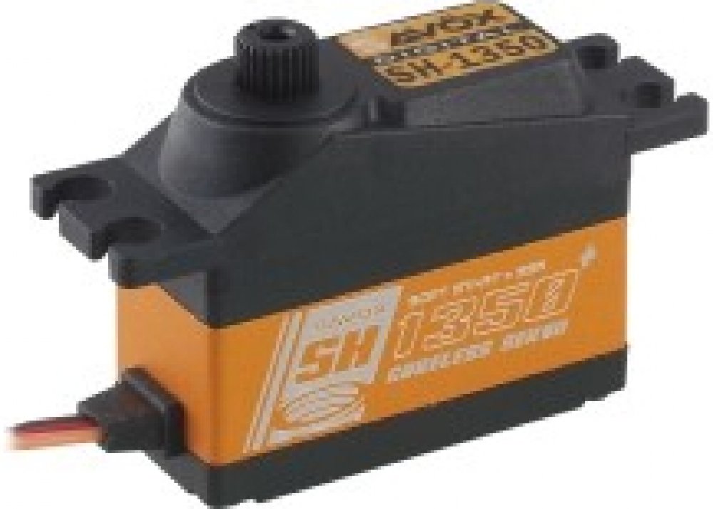 Savöx SH-1350+ BB Digital Servo SAVÖX . Serva a příslušenství. Digitální miniservo s coreless (bezjádrovým) motorem, plastovými převody a dvěma kuličkovými ložisky. Tah: 3,7/4,6 kg/cm při 4,8/6,0 V, rychlost: 0,13/0,11 s /60° při 4,8/6,0 V, Provozní napětí: 4,8–6,0 V, rozměry: 35,0×15,0×29,2 mm, hmotnost: 26 g.