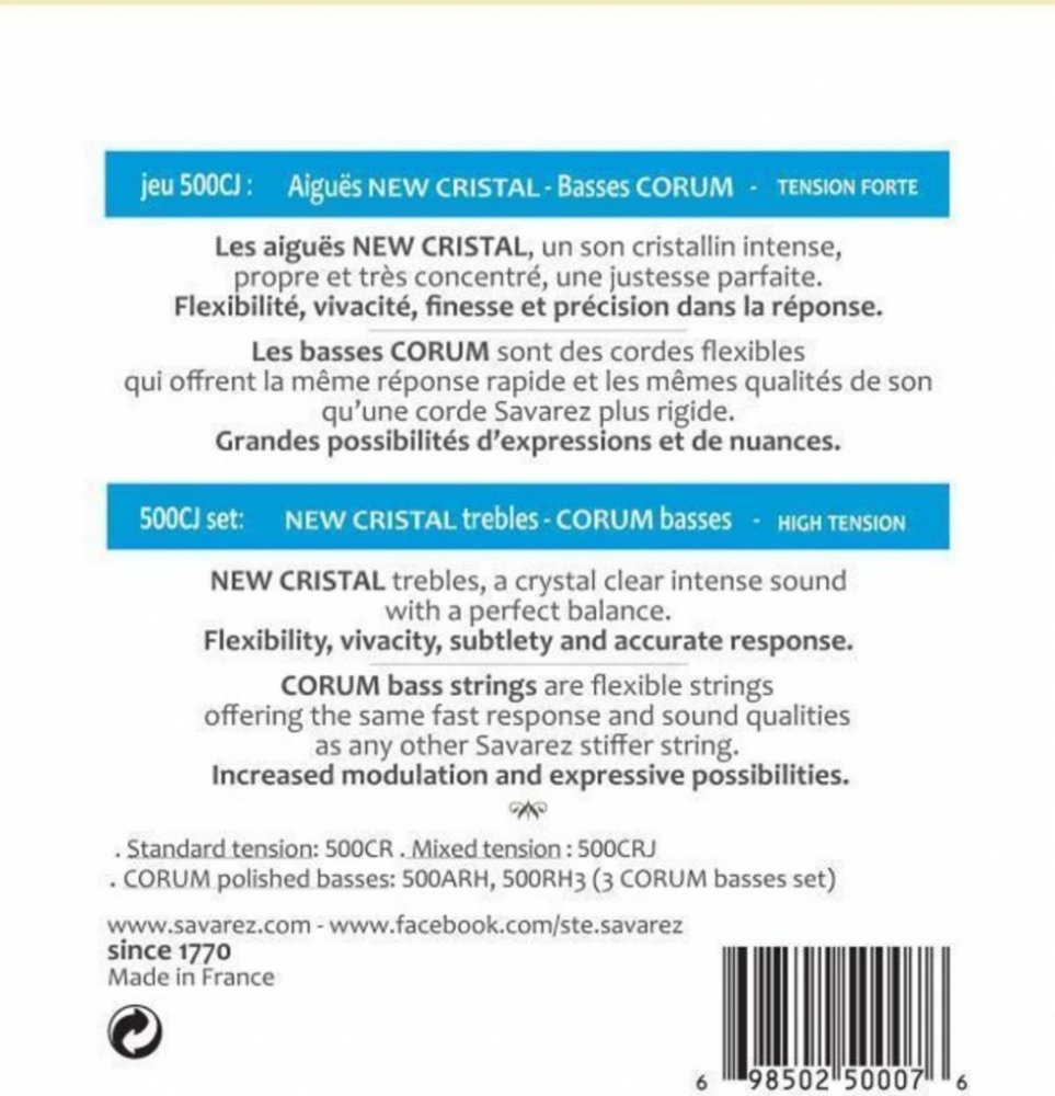 Nylonové struny pro klasickou kytaru SAVAREZ NEW CRISTAL CORUM 500CJHistorie firmy Savarez sahá až do 18. století, kdy rodina Savarezů přicestovala z Itálie do Francie, kde začala vyrábět struny z klasických střívek. Jak šel vývoj, měnila se i strategie firmy a postupem času se firma Savarez vypracovala až mezi technologickou špičku ve svém oboru. Dnes se řadí mezi přední výrobce strun a dalšího příslušenství pro strunné nástroje. Struny New Cristal Corum 500CJ jsou složené ze dvou odlišných typů strun. Melodické struny jsou vyráběny technologií New Cristal, která zaručuje strunám dokonalou hladkost a kulatost. To vede k lepšímu zážitku ze hry a čistšímu zvuku. Basové struny jsou naproti tomu vyráběné technologií Corum, která je označována za revoluční. Jde o struny s velmi rychlou odezvou - dokonce tak rychlou, že by odezva odpovídala strunám naladěným do daleko vyšších poloh. Přesto si struna zachovává své přirozené vlastnosti jako jsou jasný a bohatý zvuk, hratelnost a flexibilita. Jde o sadu velmi kvalitních strun.