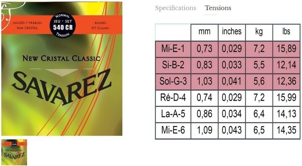 Savarez SA 540CR je nylonová sada strun pro klasickou kytaru. Struny nabízejí jasný tón bohatý na harmonie. Jedná se o struny z řady New Cristal upravené novou technologií zajišťující větší stabilitu ladění, delší životnost a menší odpor prstům při hře. Jsou tak méně zatěžována bříška prstů, a tím pádem jsou vhodné pro žáky a studenty uměleckých škol či začátečníky samouky. Basové struny jsou opředeny postříbřenou mědí. Tvrdost strun je Medium.