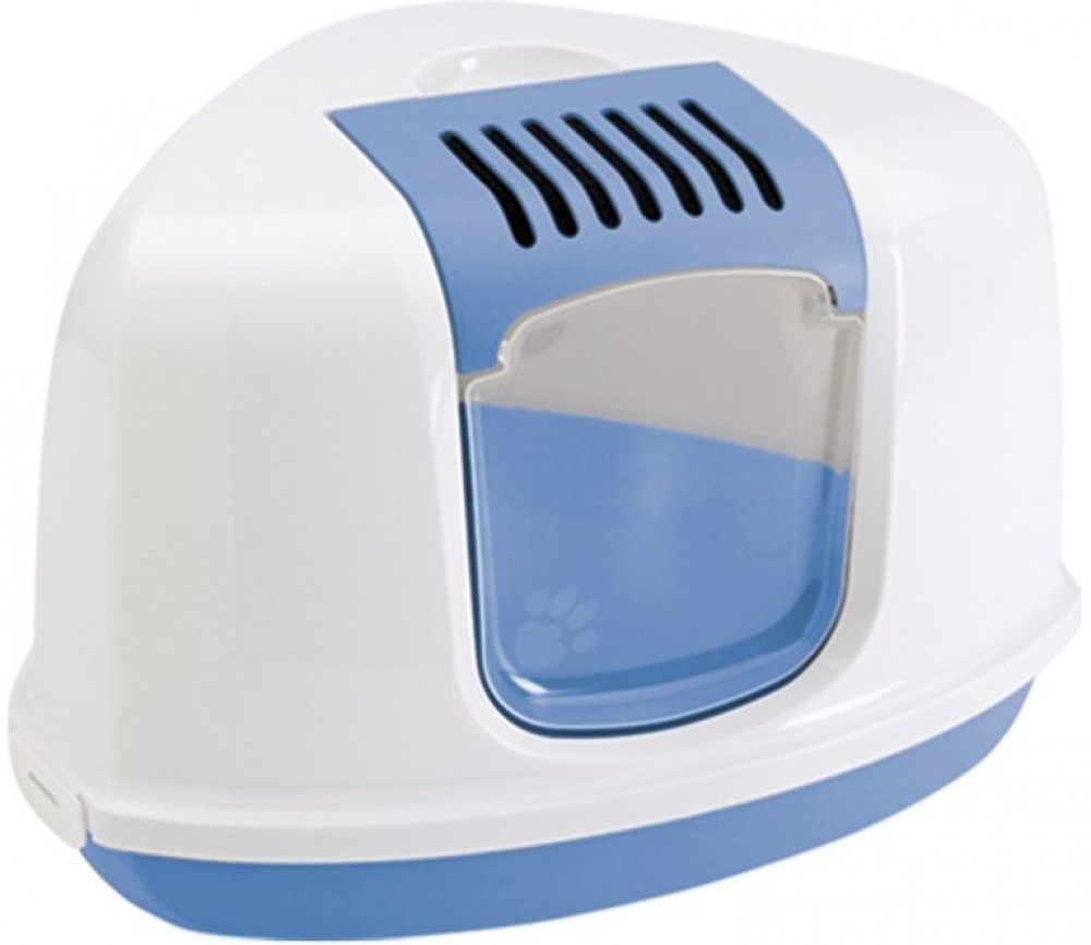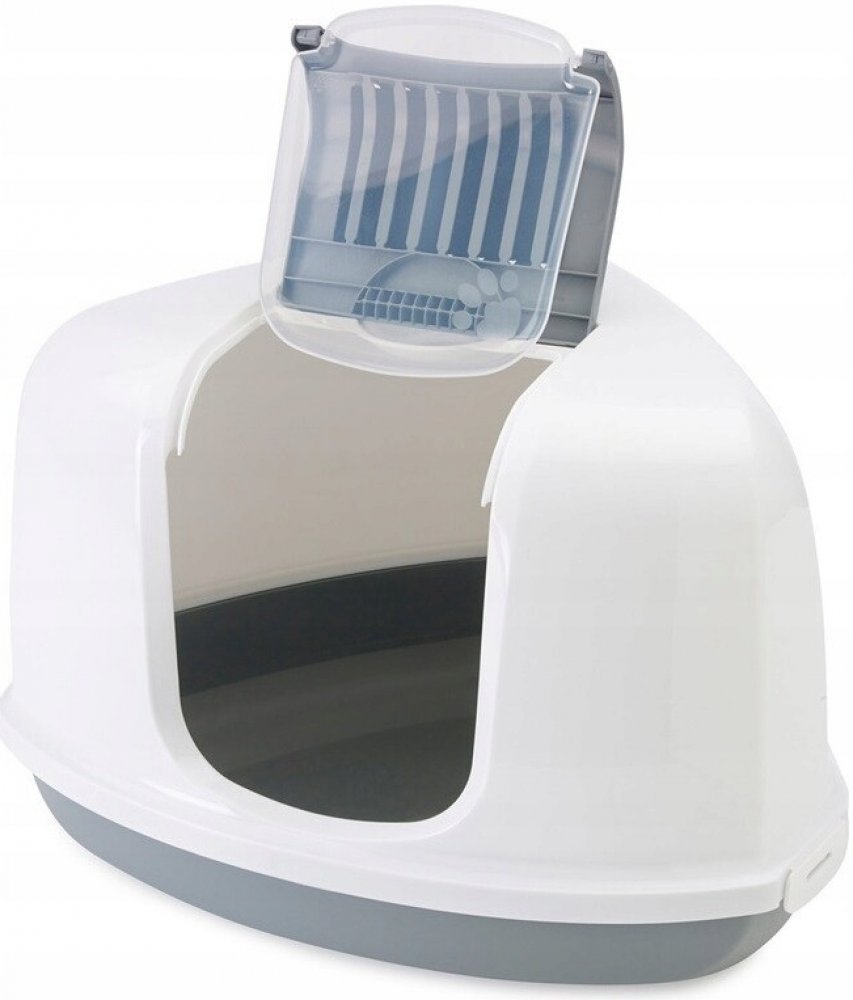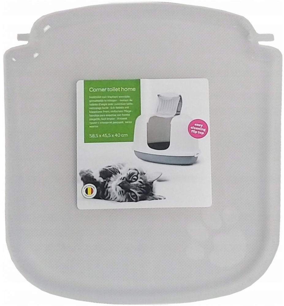 Rohová toaleta pro kočky s odklápěcím krytem pro jednoduché a rychlé čištění. S filtrem z aktivního uhlí. Délka 58,5 cm, šířka 45,5 cm, výška 40 cm.