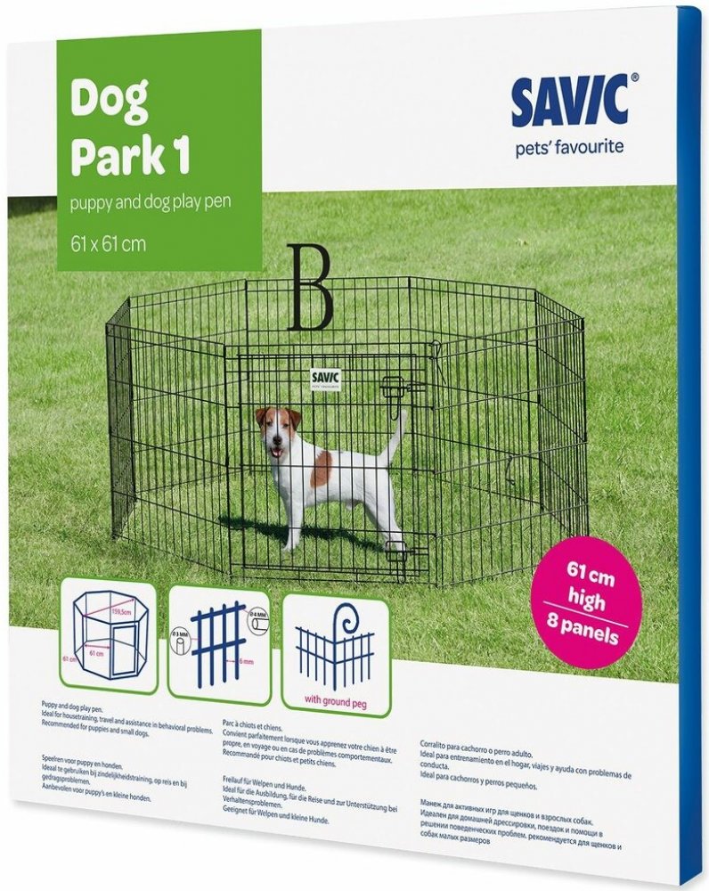 Savic Ohrádka Dog park 1 je kovová ohrádka s dvířky určená pro psy. Skládá se z 8 dílků o velikosti 61 cm x 61 cm. Výška ohrádky 61 cm, průměr 1,5 metru. Pro domácí i venkovní použití.