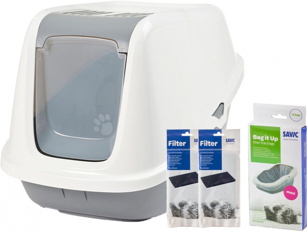 Toaleta SAVIC Nestor má extra vysokou spodní nádobu a to zaručuje těsnost toalety. Díky zvýšené zadní části je vhodná také pro kočky, které svoji potřebu vykonávají ve stoje. Dvoubarevný kryt ze zabudovaným úchytem se pomocí dvou zástrček připevní ke spodní nádobě. Pro jednoduché čištění je možno kryt vyklopit. Ve krytu je zabudovaný filtr z aktivního uhlí, který zajistí, že nepříjemný zápach neproniká ven z toalety. Filtr pravidelně vyměňujte. Toaleta Nestor se výborně hodí při navykání bojácných koček či koťat na toalety s krytem. Zpočátku nechte kryt vyklopený, aby si kočka mohla pomalu zvykat. Vysokou spodní nádobu je možno používat i bez krytu. Výhodná sada II obsahuje: Toaleta Savic Nestor bílo-šedá + 2 x náhradní uhlíkový filtr + 12 ks Bag it up sáčky Savic kočičí toaleta Nestor v přehledu: barva: bílá s decentní světle šedou či modrou vysoká spodní nádoba vyklápěcí kryt plynule vyklápěcí dvířka z průhledného plastu zabudovaný úchyt v krytu 1 filtr z aktivního uhlí součástí dodávky Made in Belgium Rozměry: celkem: D 56 x Š 39 x V 38,5 cm podlaha: D 45 x Š 29 cm spodní nádoba uvnitř: cca D 50 x Š 34 x V 12-25 cm vchod: Š 21 x V 20 cm výška vstupu: 14 cm Doporučujeme: svorky k uzavření vyklápěcího krytu ohněte mírně směrem dovnitř. Tím můžete kryt rychleji a snadněji otevřít a zavřít. Poznámka: Pokud se při nasazování dvířek vyskytnou problémy, podívejte se prosím na tento návod. Savic Bag It Up Litter Tray Bags jsou ideálním doplňkem kočičích toalet. Odlehčené, průhledné fóliové vložky do kočičí toalety zabraňují usazování moči a hrudek steliva na dně a v rozích toalety. Prodlužuje se tím životnost toalety, sáčky zároveň zabraňují rozšiřování zápachu a usnadňují úklid. Více informací o Savic Bag It Up Litter Tray Bags naleznete zde: Savic Bag It Up Litter Tray Bags