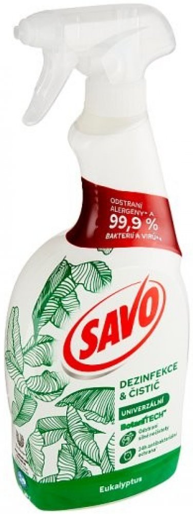 Čisticí sílainspirovanápřírodou.Odstraní 99.9 % bakterií a virů1 včetně Sars-CoV-2Antibakteriální ochrana2S výtažky čajovníku a eukalyptuDermatologicky testovanépH neutrálníSavo BotaniTECH s čistící složkou na 100% přírodní báziSavo BotaniTECH 700 ml je čisticí a dezinfekční sprej, který je doplněn o praktický rozprašovač. Spolehlivě pečuje o všechny omyvatelné povrchy. Sprej můžete využít například na čištění kuchyňské linky, vany, umyvadla, dveří a dalších povrchů. Savo BotaniTECH lze využít také na čištění a dezinfekci povrchů, které přicházejí do styku s potravinami.Příjemná vůně citrusůSložení Sava BotaniTECH obsahuje vonné látky z citronu, pomeranče, máty, eukalyptu a citronové trávy, které se postarají postará kromě čistoty také o příjemnou vůni vašeho domova.Jak dezinfekci správně použítSavo BotaniTECH nastříkejte rovnoměrně na čištěný povrch a nechte působit 5 minut. Před použitím důkladně opláchněte pitnou vodou a nechte uschnout.To chci1 Účinný proti virům, včetně...