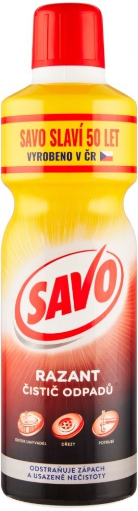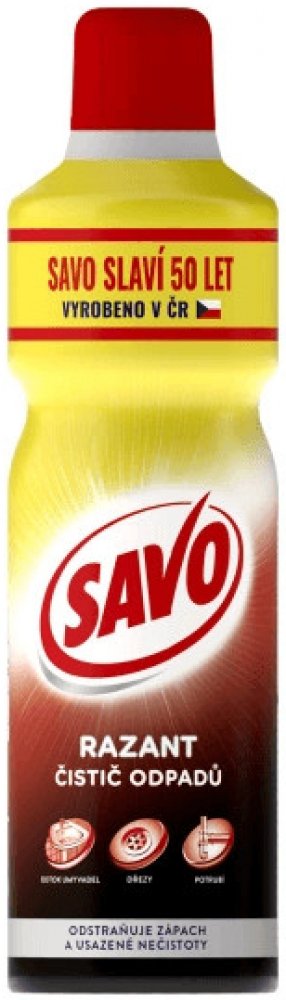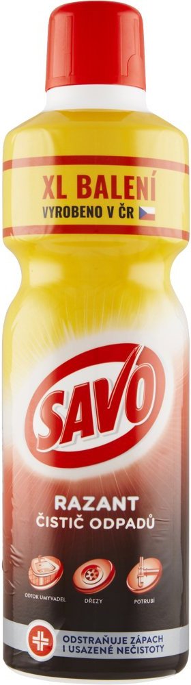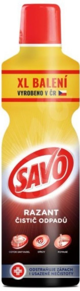 XL balení SAVO Razant je vysoce účinný gelový tekutý prostředek se zesíleným účinkem na uvolnění ucpaných odpadů a na odstranění nepříjemného zápachu.