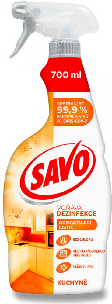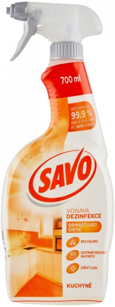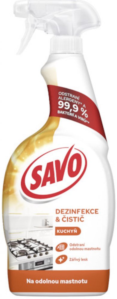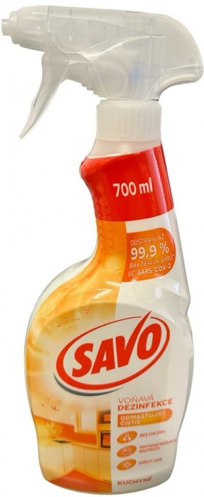 Savo Kuchyně Dezinfekce bez chloru odmašťovač sprej 700 ml Velmi kvalitní tekutý čistící a zároveň dezinfikující prostředek na velkou špínu a mastnotu v domácnosti. Přípravek dokonale odstraní bakterie a alergeny z domácnosti bez použití chloru. Vyčistíte podlahu, kuchyni, koupelnu i další povrchy od silné mastnoty, prachu, pylu a bakterií od domácích mazlíčků. Umyté zevnějšky domácnosti přetřete vlhkým hadříkem. Zvýšíte antibakteriální účinky prostředku, když tekutinu na čištěném povrchu necháte působit 5 min. Vaše podlaha i další omyté povrchy budou zářit čistoto