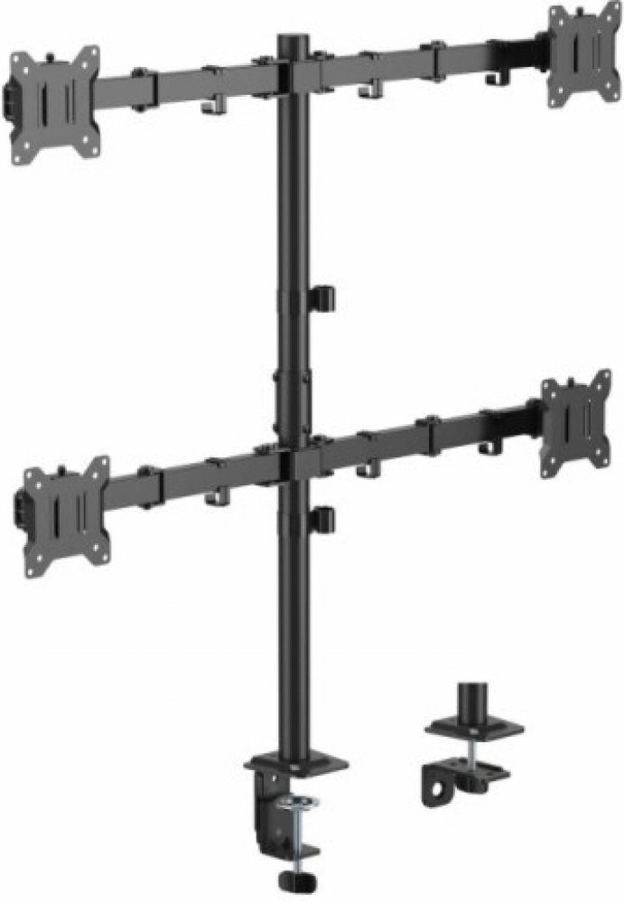 The LCD-352/4-3 desk mount transforms any workspace into a modern, organized, and ergonomic setup. It supports four monitors from 17" to 32" (VESA 75×75 / 100×100) with a load capacity of up to 10 kg per screen. With a wide range of motion – tilt +45°/-45°, swivel +90°/-90°, and rotation +180°/-180° – each monitor can be positioned precisely to your ideal viewing angle. Featuring 376 mm arm length and a 803 mm height pole, it offers excellent flexibility for multi-display configurations, while the integrated cable management keeps the setup clean and professional. Installation is straightforward with either a desk clamp (10–85 mm) or grommet mount (10–45 mm). The detachable VESA plate makes monitor installation quick and simple. Made of steel and plastic in an elegant black finish, the LCD-352/4-3 is perfect for advanced multitasking, professional workstations, analytical setups, gaming, or creative projects – the ideal addition to any modern workspace that demands maximum productivity.