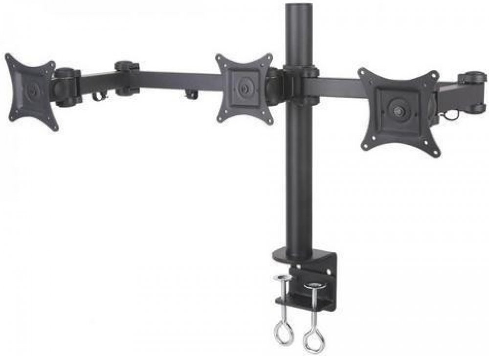 Držiak a 3 monitory, veľkosť obrazovky: 13" - 23" (33cm - 69cm), nosnosť: 7kg na monitor (21kg), min. VESA: 75 x 75, max. VESA: 100 x 100, otočný: +-90°, vertikálny sklon: +-45°, otočenie obrazovky: +-180°, svorka (hrúbka stola) 10-88 mm, rozsah ramien: 658mm, výška tyče: 443mm, pre zakrivené obrazovky: nie, vedenie káblov: áno, odnímateľná doska VESA: áno, rozmery: 1430x148x548 mm