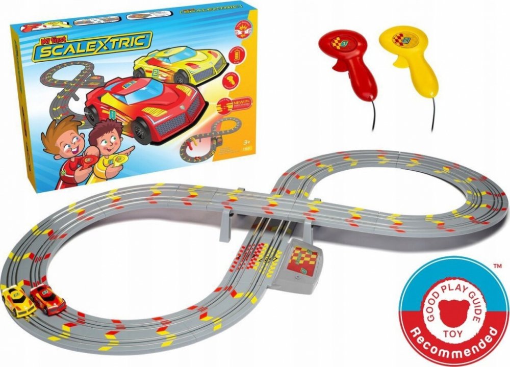 Obě závodní auta a ovladače s nastavitelným výkonem jsou barevně odlišené. Jejich červená a žlutá barva navíc odpovídá i označení jednotlivých drah na trati. Naše technologie Magnatraction pomáhá udržet autíčka na trati a nastavitelné ovladače umožňují přizpůsobit rychlost závodění zkušenostem malých závodníků. Autodráha My First Scalextric je plně kompatibilní s naší řadou autodráh a autíček Micro Scalextric. Díky tomu můžete svou dráhu neustále rozšiřovat a přidávat nová autíčka – nekonečné možnosti máte na dosah ruky!