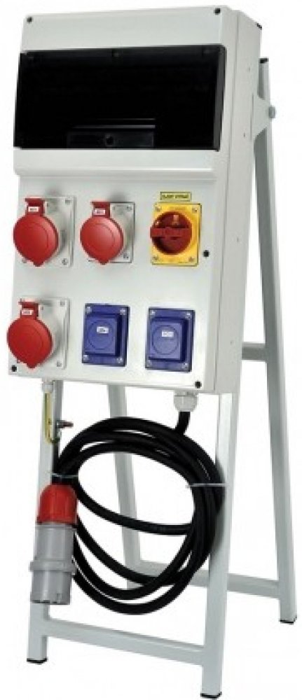 Zásuvkový staveništní rozvaděč na stojanu řady DST s kabelem a vidlicí 32A. Osazené zásuvky 2x 230V/16A, 1x 400V/16A/5p, 2x 400V/32A/5p. Jištění 2xB16/1, 1xC16/3, 2xC25/3, 1xFI-40/4/003, hlavní vypínač 40A. Jmenovitý proud rozvaděče 32A, kabel H07RN-F 5G4 délky 4m s vidlicí 400V/32A/5p.