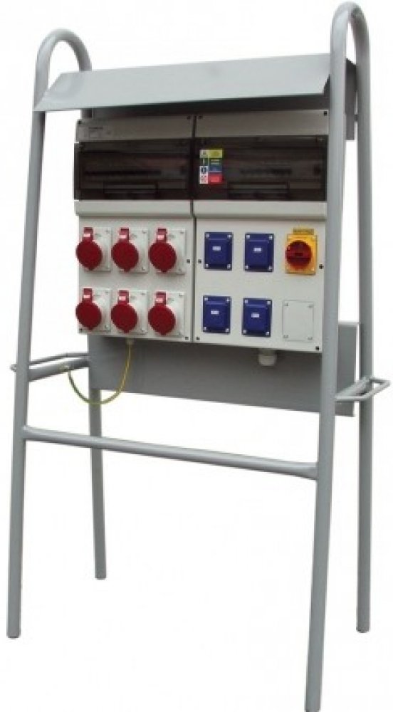 Zásuvkový staveništní rozvaděč na stojanu řady DST. Osazené zásuvky 4x 230V/16A, 3x 400V/16A/5p, 3x 400V/32A/5p. Jištění 4xB16/1, 3xC16/3, 3xC25/3, 2xFI-63/4/003, hlavní vypínač 63A. Jmenovitý proud rozvaděče 63A, svorky pro připojení do max. 5x 16mm 2 , 1x vývodka PG29.