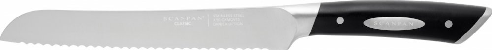 Nůž na pečivo bez námahy nakrájí úhledné plátky křupavého chleba, veky, rohlíků anebo i vypečenou kůrku vepřového bůčku. Charakteristika:Precizně vybalancovaná čepel kovaná z jednoho kusu vysoce kvalitní německé oceli mimořádně odolné proti korozi s tvrdostí HRC 56.Originální dánský design.Nový design záštity pro lepší uchopení.Geometrie rukojeti poskytuje komfortní ergonomii pro pevnější uchopení.Dokonale broušená fazeta ostří zaručuje excelentní řezné výsledky krájení.Použití a péče:Nože SCANPAN jsou navrženy jako generační nože, bude-li jim věnována patřičná základní péče. Pro zajištění dlouhé životnosti doporučujeme následující tipy:Krájení na měkkém, hladkém povrchu jako je bambusové dřevo nebo plastové prkénko, pomůže zabránit předčasnému ztupení čepele.Pravidelné ostření nožů SCANPAN zajistí, že si nože udrží ostrou hranu čepele.Nože SCANPAN lze mýt v myčce nádobí. Použití drsných čisticích prostředků však může způsobit změnu barvy rukojeti a vznik důlkové koroze na čepeli. Jedná se o precizní krájecí náčiní, a proto by se mohlo ostří čepele otupit, pokud by se dostalo do kontaktu s jinými předměty v myčce na nádobí. Doporučujeme proto, abyste nůž myli ručně a poté důkladně osušili.K uskladnění nožů používejte bloky nebo magnetické lišty na nože, abyste ochránili čepel nože. Nože neukládejte volně v zásuvce. Balení:Výrobek je dodáván v krabičce, která rovněž zaručuje, že se nůž při nepoškodí. Nůž na chléb z nerezové oceli s délkou čepele 20cm. Řeže bez námahy jak tvrdou chlebovou kůrku, tak měkké buchty, ale i třeba takové dobroty, jako jsou křupavé vepřové kůrky.