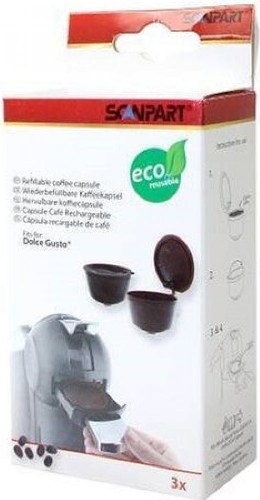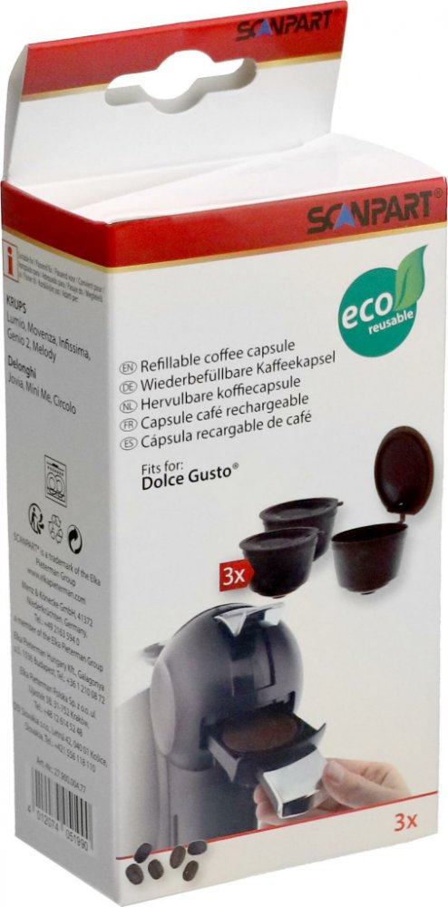 Opakovaně plnitelná kapsle na kávu do kávovarů DolceGusto šetří nejen vaši peněženku, ale také životní prostředí. Navíc si můžete vybrat kávu, jakou máte rádi či kterou máte zrovna doma. Takže i když vám dojdou kapsle, o voňavou kávu z vašeho oblíbeného kávovaru nepřijdete ani vy, ani případná návštěva. Opakovaně plnitelnou kapsli Scanpart lze mýt v myčce na nádobí a v balení obdržíte hned 3 kusy....