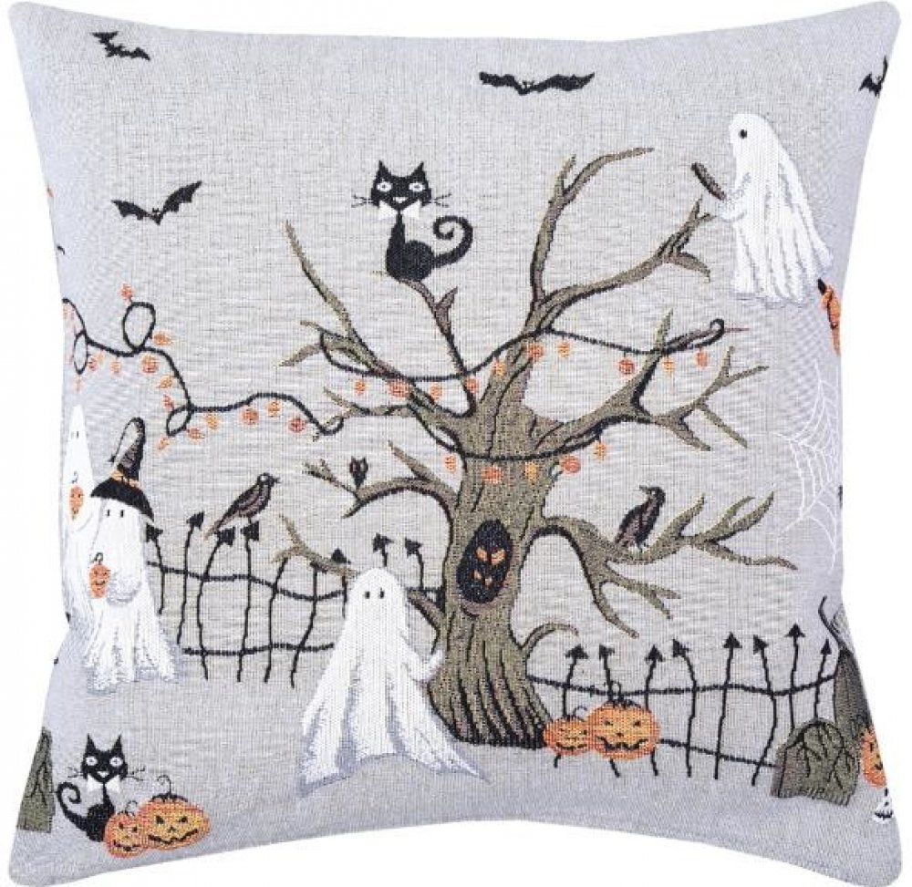Roztomile děsivý šedý povlak na dekorační polštářek je jako dělaný pro nadcházející Halloween. Užijte si rej duchů a strašidel kolem rozložitého starého stromu. Kolem poletují netopýři, kočky na Vás zlověstně pomrkávají a ve vydlabaných dýních vítr už dávno sfouknul svíčky… A navíc jste na opuštěném starém hřbitově! Kdo by se nebál? Povlakem na polštář se zajímavým vytkaným motivem můžete doplnit a ozvláštnit každý interiér. Váš obývací nebo dětský pokoj získají rázem veselý a optimistický vzhled :) Může být i překvapivým dárkem, kdykoliv si ho Vaši přátelé povléknou, vzpomenou si na Vás.