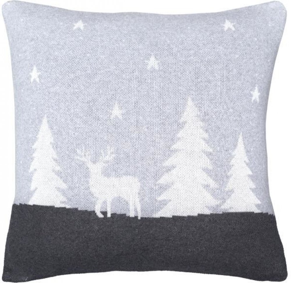 Elegantní zimní povlak na dekorační polštářek se sobem, stromy a hvězdičkami, které dokreslují zasněženou noční krajinu. Povlak je vyveden v šedých odstínech s bílými detaily a sluší modernímu i klasickému interiéru.