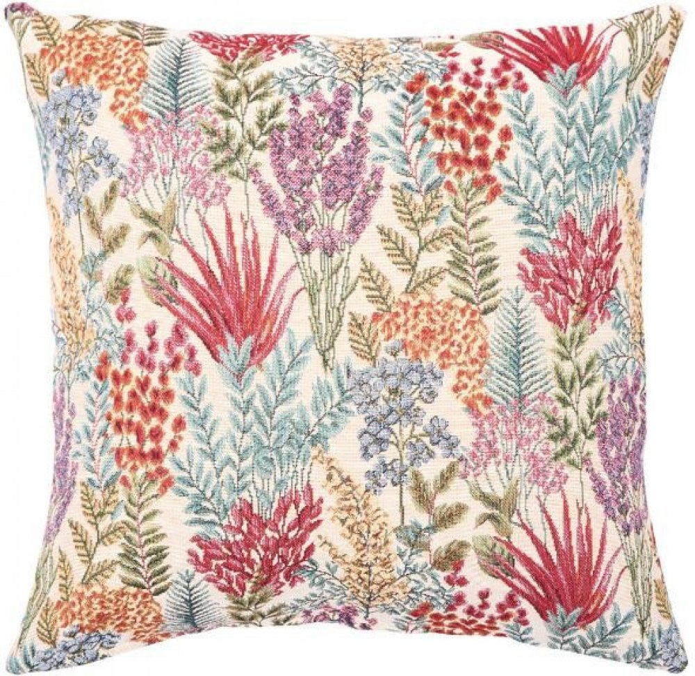 Béžový povlak na dekorační polštářek s tkaným vzorem pestrých květin Vás přenese do letní zahrady, kde si polední vánek pohrává s listy. Lákavé květy jsou vyvedeny v odstínech tyrkysové, karmínové červené, zelené a fialové barvy. Povlak naaranžujte na svou sedačku a Váš obývací pokoj získá svěží nádech.