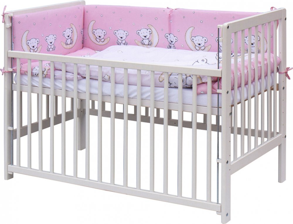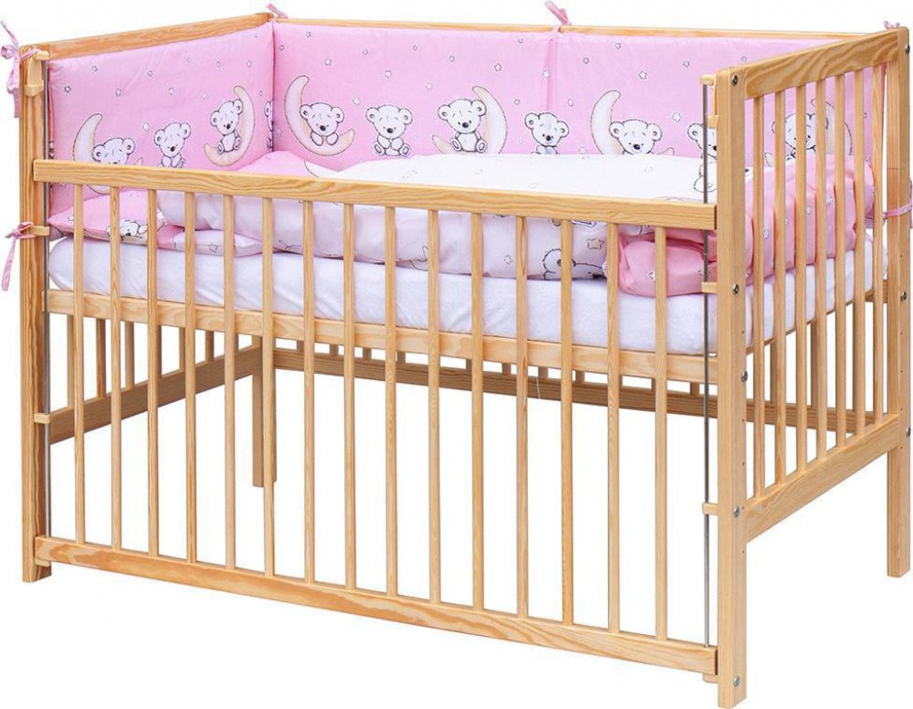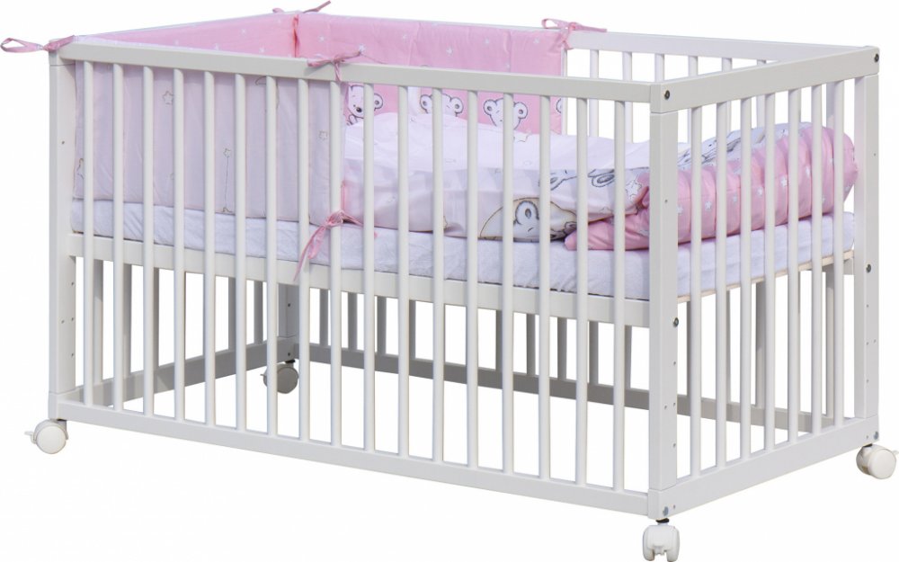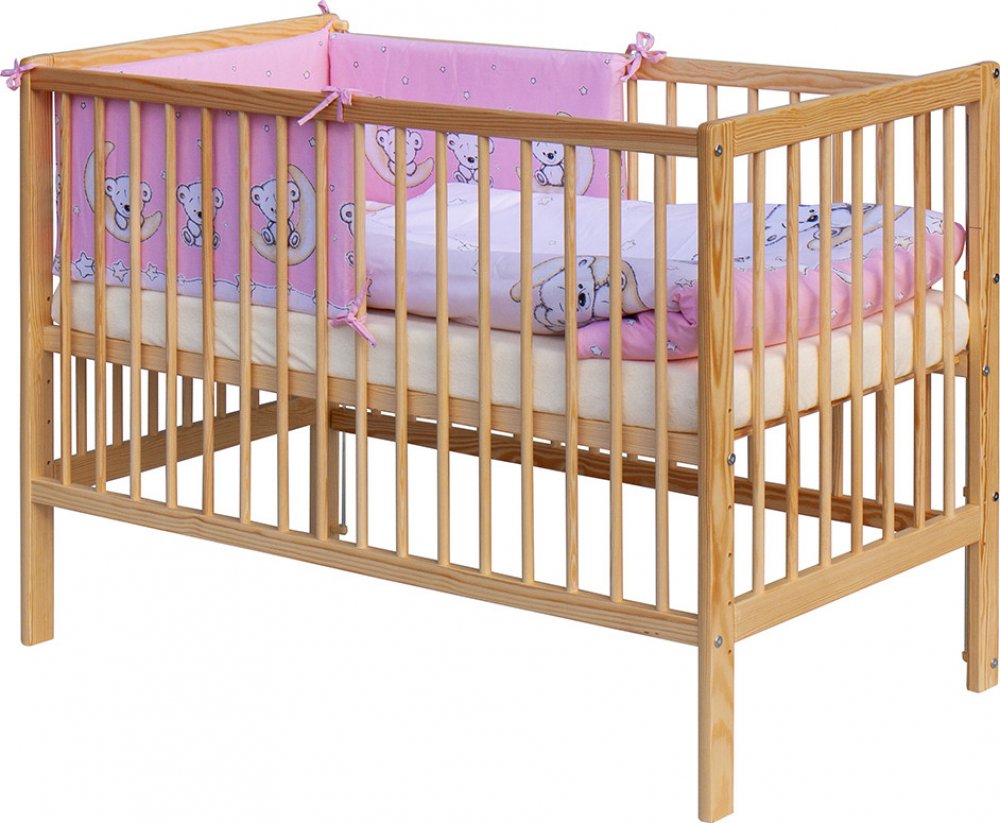 - Dřevěná dětská postýlka 120 x 60 cm - přírodní masiv borovice, stahovací bočnice, 6 poloh pro nastavení roštu.